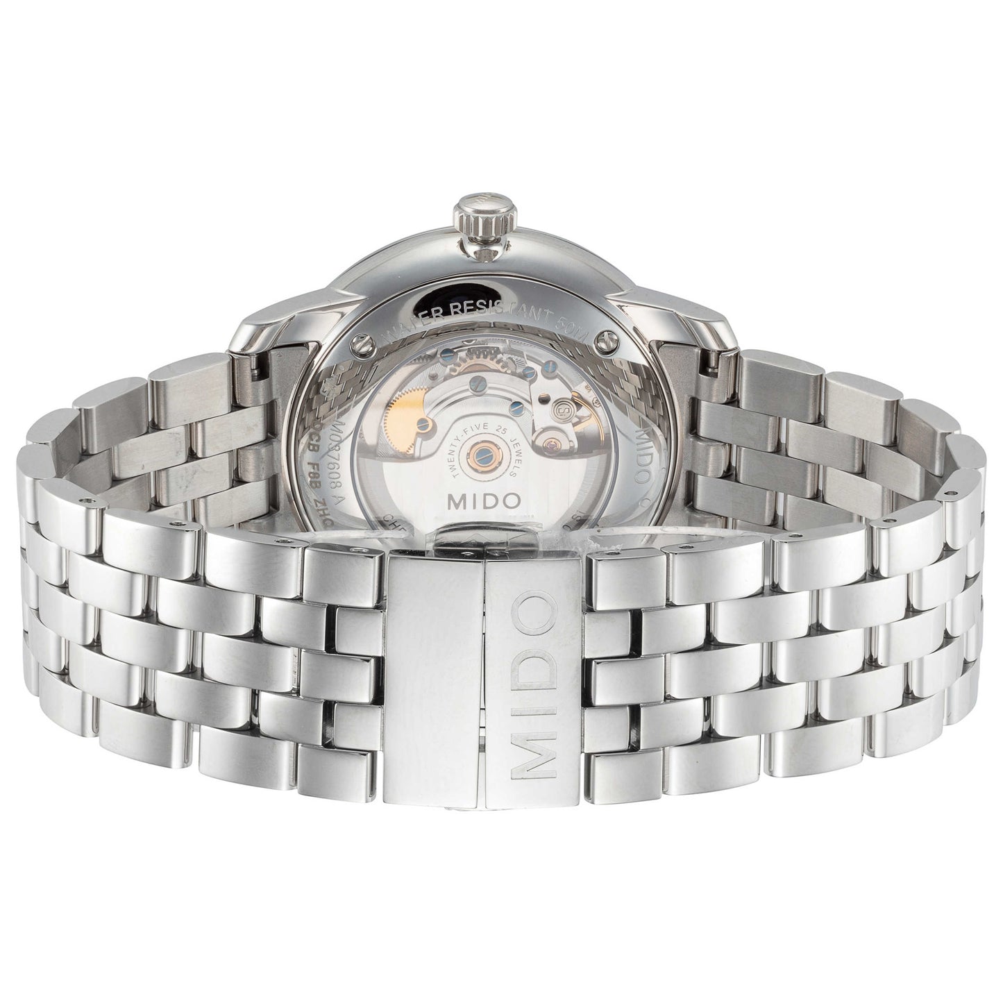 Discover the Swiss precision of the Mido Baroncelli Jubilee men's watch. This automatic, Mido Calibre 80 powered timepiece has an impressive 80-hour power reserve, a handy date feature at 3 o'clock, and is controlled by a pull and push crown. The robust stainless steel, round 42mm case, houses a sleek black dial under a scratch-resistant sapphire crystal. The exhibition back reveals the meticulous movement. Its stainless steel bracelet in silver clasps securely with a deployment clasp. With a 50m water resistance, this piece blends reliability with effortless style. M0376081105200
