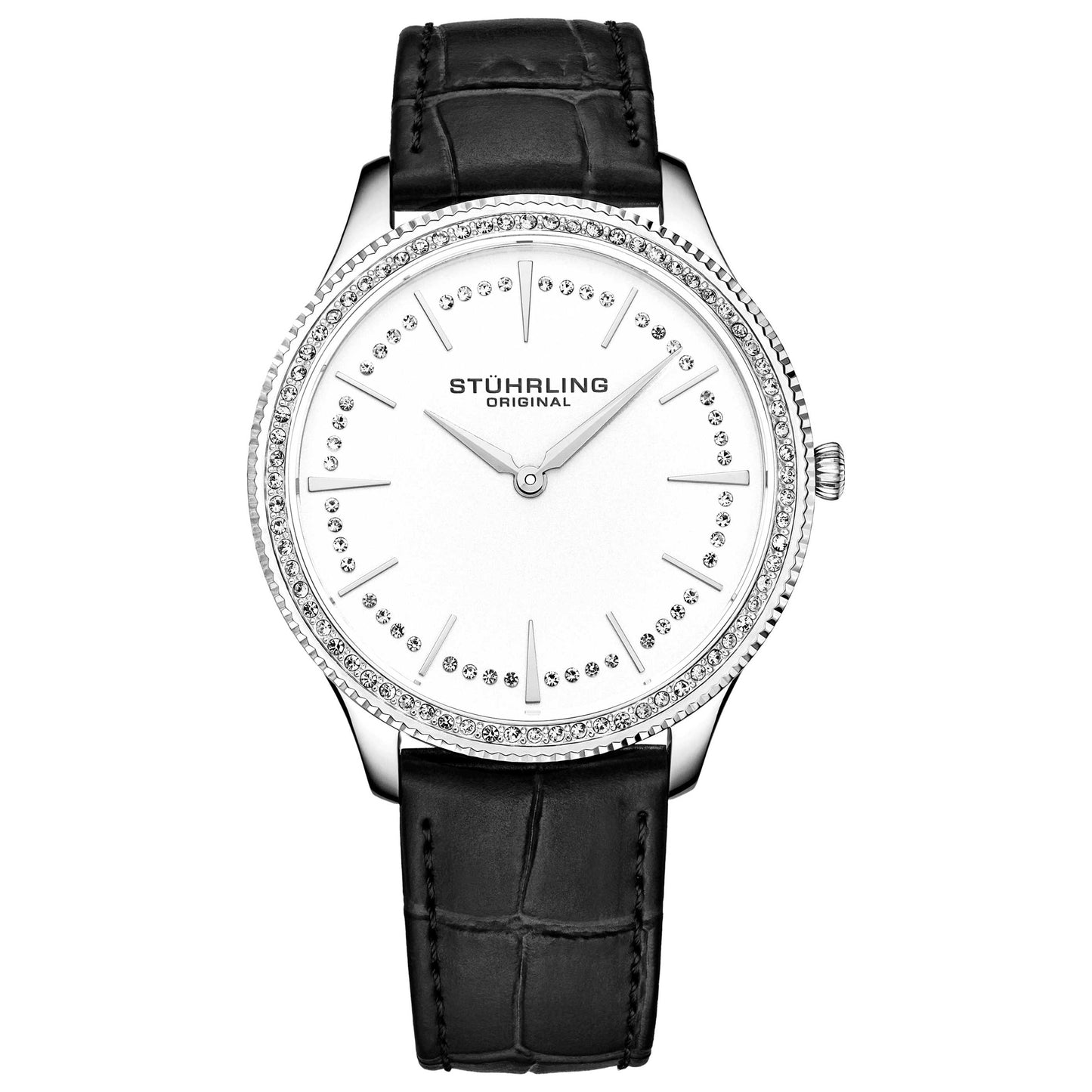 Make a statement with the women's Stuhrling Symphony watch, a sophisticated piece with a harmonious blend of style and functionality. This quartz movement timepiece features a silver-tone round stainless steel case, measuring 38mm in width, with a fixed bezel and a pull and push crown. The silver dial is elegantly framed by a mineral crystal, providing protection up to 30m water resistance. Complementing the silver tone of the watch is a sleek black leather strap, ensuring a comfortable and secure fit with its pin buckle clasp. Experience the flawless fusion of precision and luxury with the Stuhrling Symphony. M15151