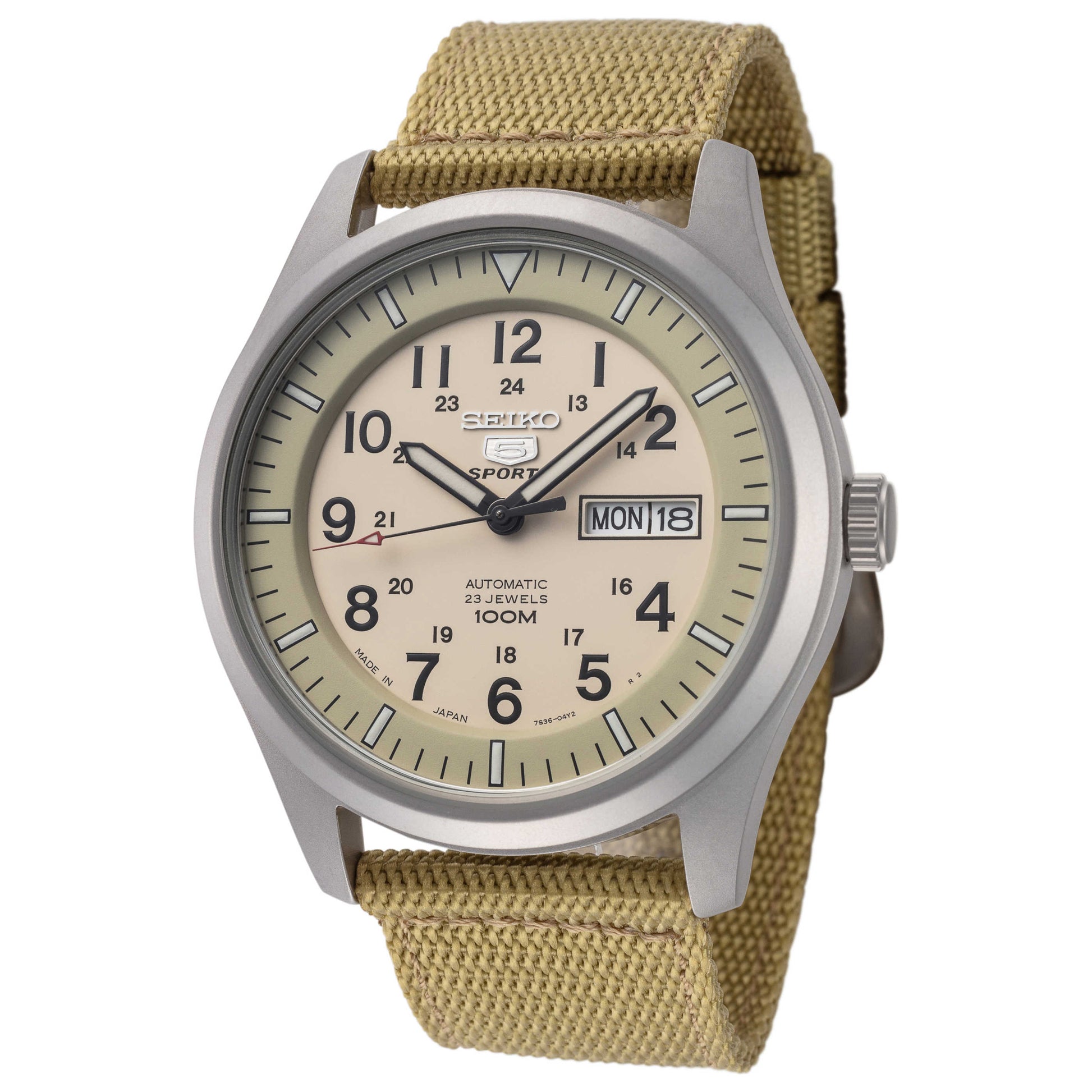 The Seiko Series 5 Sport men's automatic watch features a date display at 3 o'clock, housed in a round stainless steel case with Hardlex crystal and exhibition case back. The watch has a 42 mm case size and 100 m (330 feet) water resistance rating. Seiko Caliber 7S36 movement powers the beige dial, which is fastened with a beige fabric strap using pin buckle clasp.