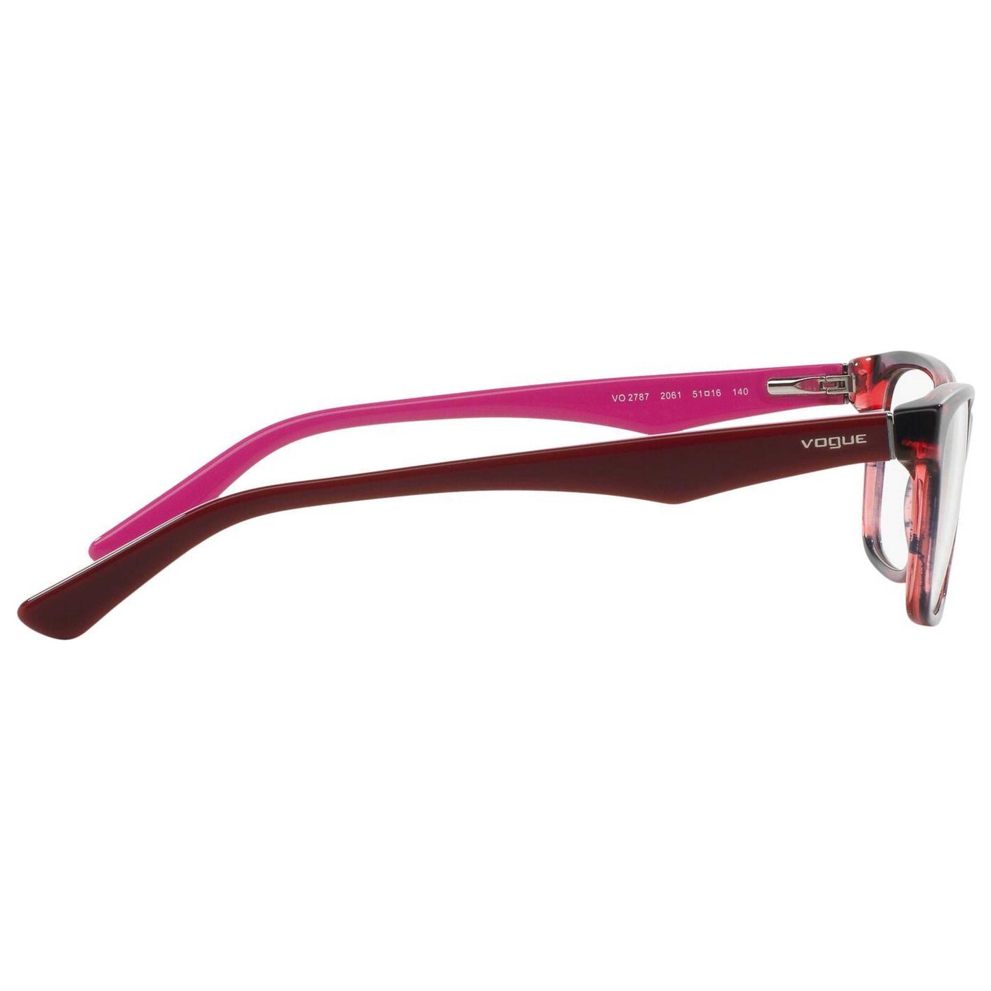 Showcase your style with Vogue's women's opticals. Crafted from premium acetate, these square frames exhibit a unique striped black cherry hue that captures attention. The 53 mm lens width ensures a flattering fit. With Vogue, add a touch of elegance to your everyday look, because style is about the detail. VO2787-2061-53