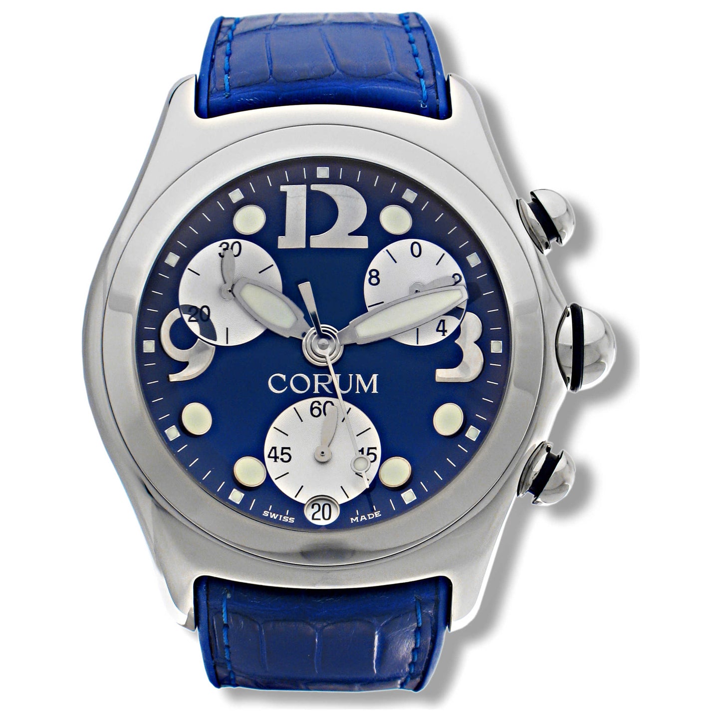 Corum, Bubble XL Chronograph, Men's Watch, Stainless Steel Case, Leather on Rubber Strap, Quartz Swiss Made Movement The Corum Bubble, with its domed sapphire crystal with anti-glare protection, really is a conversation piece. The leather-stitched-to-rubber bracelet is also a phenomenal achievement in design.Founded in 1956 in La Chaux-de-Fonds, Switzerland, the Corum brand achieved prominence because of its simple philosophy -- "superb craftsmanship combined with the endless search for beauty and innovation." This initial commitment to excellence still prevails today. Preserving the tradition of of precision craftsmanship, as well as keeping a keen eye on the future, Corum remains on the cutting edge of luxury Swiss watchmaking.