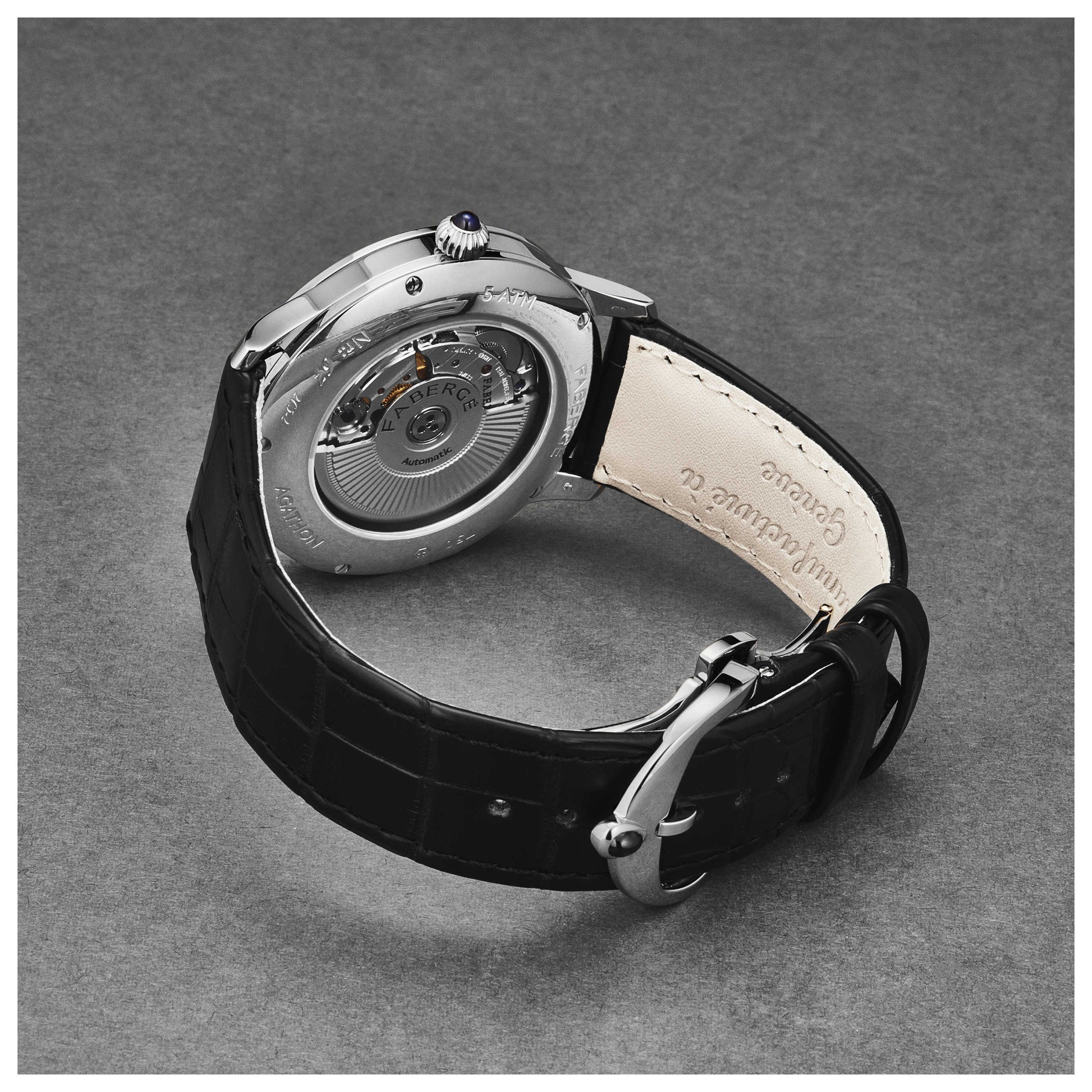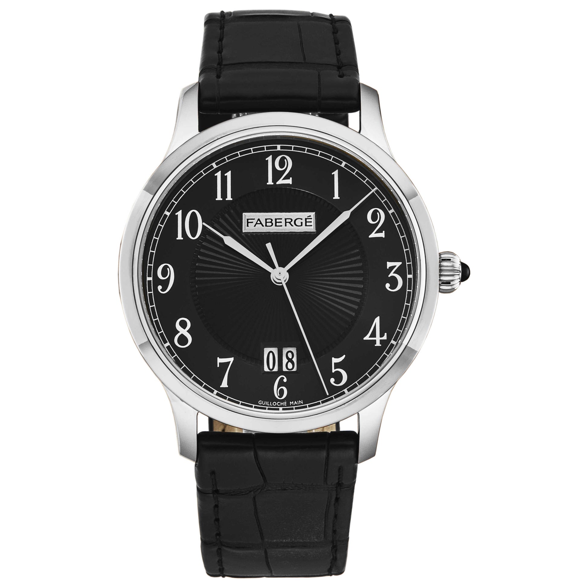 Make an impression with the men's Faberge Agathon watch, a Swiss-made treasure showcasing unparalleled elegance. Crafted from 18K white gold, this automatic timepiece features a round 40mm case with a striking black dial, protected by scratch-resistant sapphire crystal. Its pull and push crown and power reserve of 72 hours add convenience to your busy lifestyle. Encased within an exhibition back, it's water-resistant up to 50m. The black leather strap brings a timeless appeal, fastened securely with a deployment clasp. Never miss a date with this watch's built-in feature. FAB-206