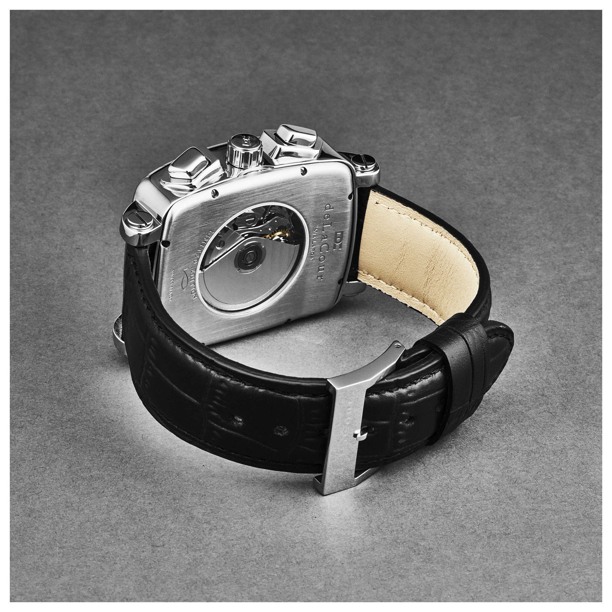 Make every moment count with the DeLaCour ViaLarga watch, tailored specifically for men. This made-in-Switzerland automatic chronograph showcases a striking green dial, housed in a 38mm stainless steel rectangular case with scratch-resistant sapphire crystal and an exhibition case back. Resistant to water depths up to 30 m, it features a sleek black leather strap with a secure pin buckle, ideal for everyday style and reliability. Perfect for the man who appreciates precision and robust functionality in a timepiece. WAST1026-GRN