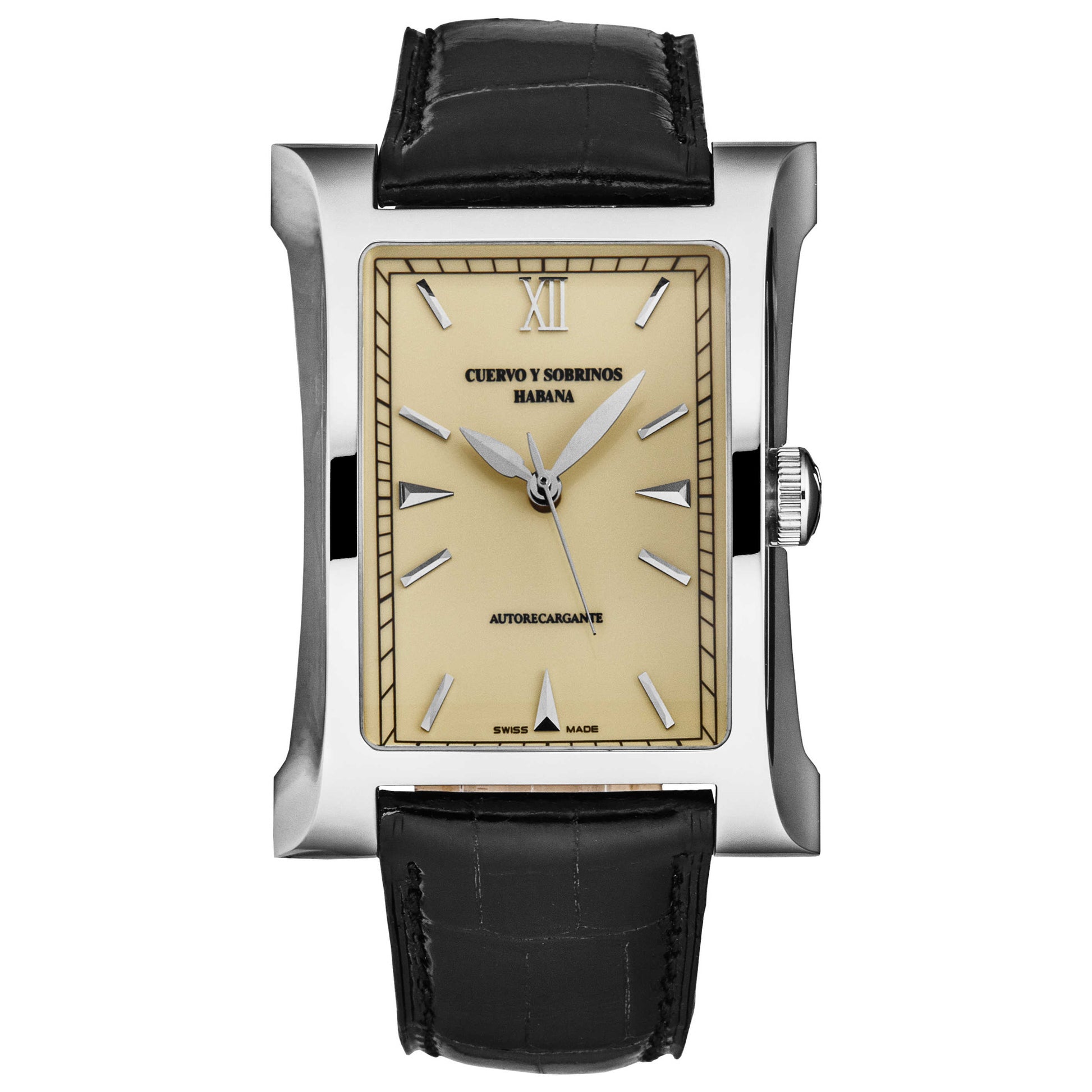 Enhance your wardrobe with the Cuervo y Sobrinos Esplndos1882 watch, a men's Swiss-made piece of precision and luxury. Housed in a 35mm rectangular stainless steel case is a cream-colored dial, safeguarded by scratch-resistant sapphire crystal. The automatic Swiss-Made movement is showcased by an exhibition case back and is easily adjustable with the pull and push crown. This timepiece offers 30m water resistance. Adding to its sophistication, a black leather strap ensures a secure fit with a pin buckle. A refined choice for the discerning man. 2412.1CD