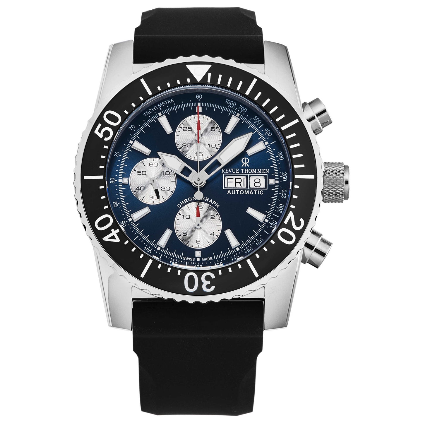 Take on the day with the Revue Thommen Diver watch, a rugged yet stylish choice for the modern man. Crafted in Switzerland, this automatic VJ 7750 movement watch offers a robust stainless steel round case with a scratch-resistant sapphire crystal. The 45mm case features a screw-down crown, guaranteeing a water resistance up to 300m. It showcases a striking blue dial equipped with a chronograph and date function. Wrapped with a black rubber strap that fastens securely with a pin buckle, this Swiss-made timepiece provides an unbeatable blend of durability and elegance. 17030.6525