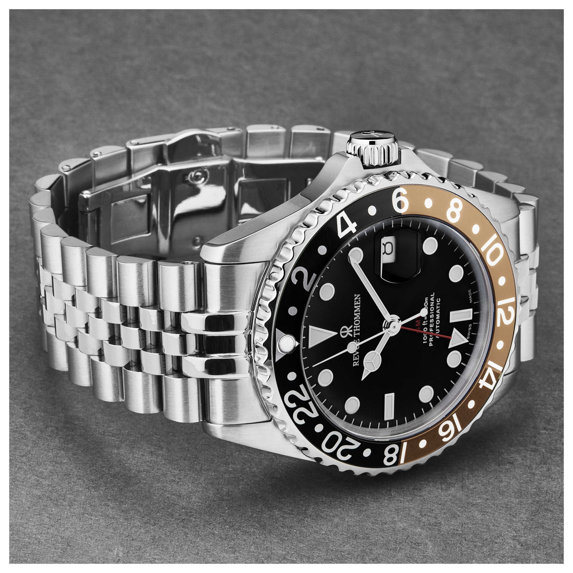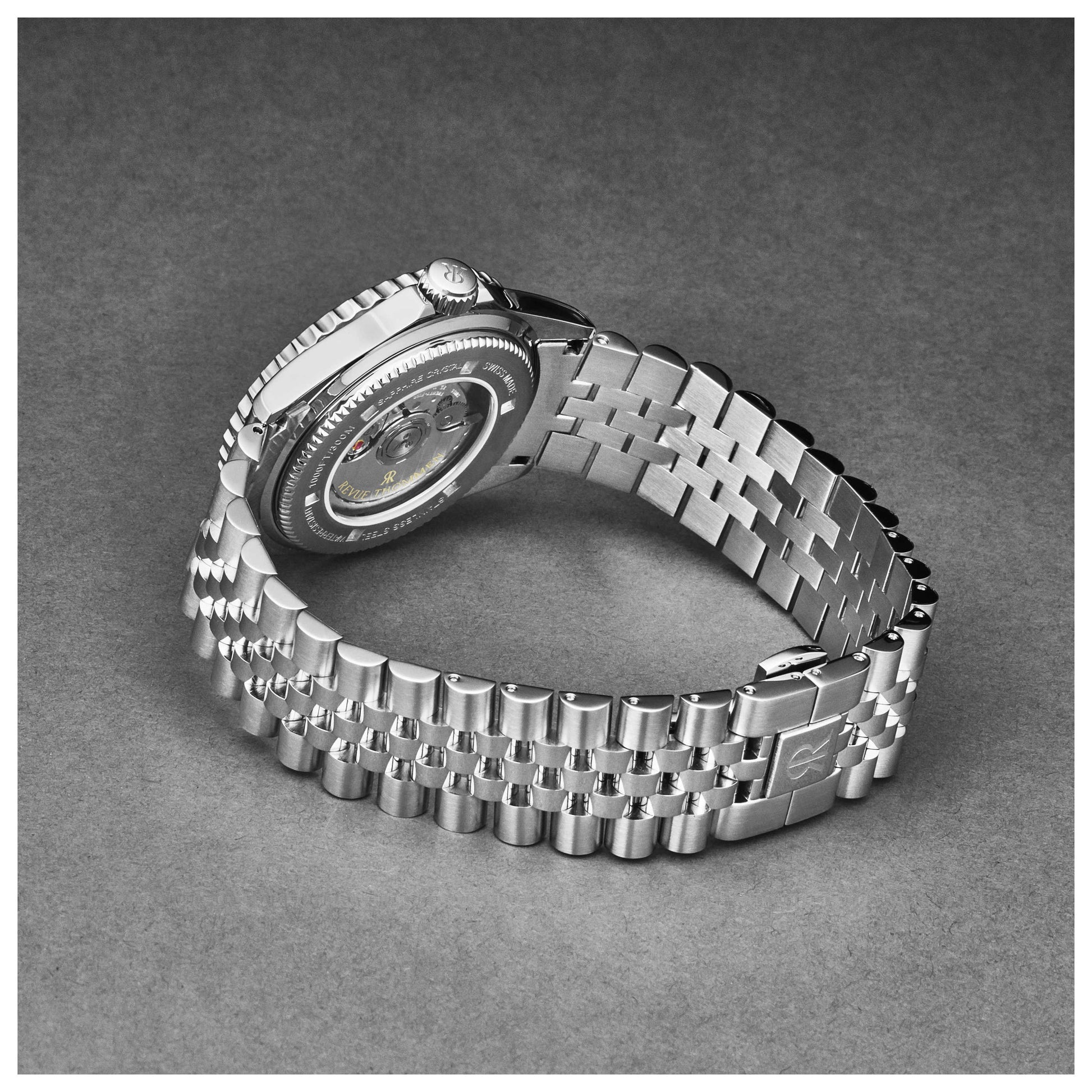 Introducing the men's Revue Thommen Diver watch, meticulously crafted in Switzerland. This automatic timepiece, powered by the SW330-1 movement, offers a generous 42-hour power reserve. The round 42mm stainless steel case sports an exhibition back and is capped with a scratch-resistant sapphire crystal. Its screw-down crown guarantees a water resistance of up to 300m. The black dial prominently displays a date feature at 3 o'clock. Fitted with a silver stainless steel bracelet that securely fastens with a deployment clasp, this watch is perfect for men who value precision and durability. 17572.2232