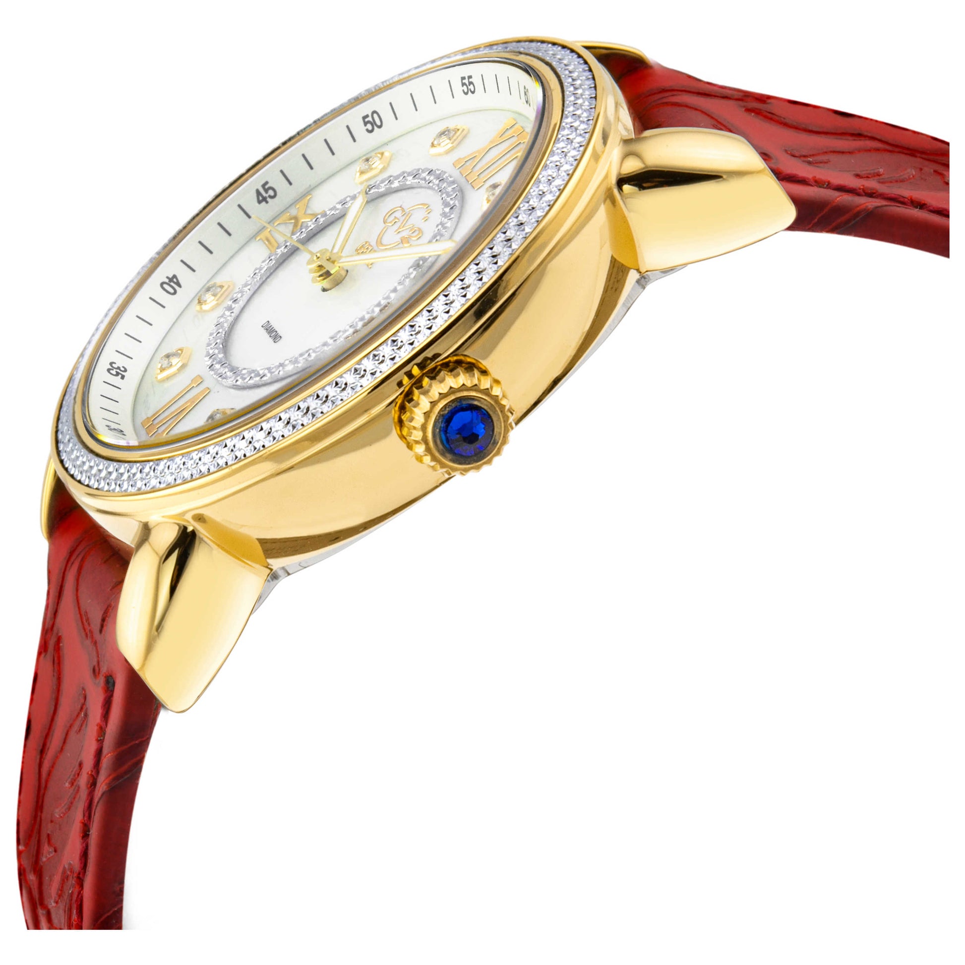 Introduce a splash of color to your style with the GV2 by Gevril Marsala watch, a striking Swiss-made timepiece designed for women. Encased in a 37mm stainless steel round case is a charming white mother-of-pearl dial, protected by an anti-reflective, scratch-resistant sapphire crystal. With a pull and push crown, this watch features a reliable quartz movement and a closed back, providing a 50m water resistance. This enticing timepiece comes adorned with a red leather strap, secured by a pin buckle, adding a pop of vibrant elegance to any outfit. 9866