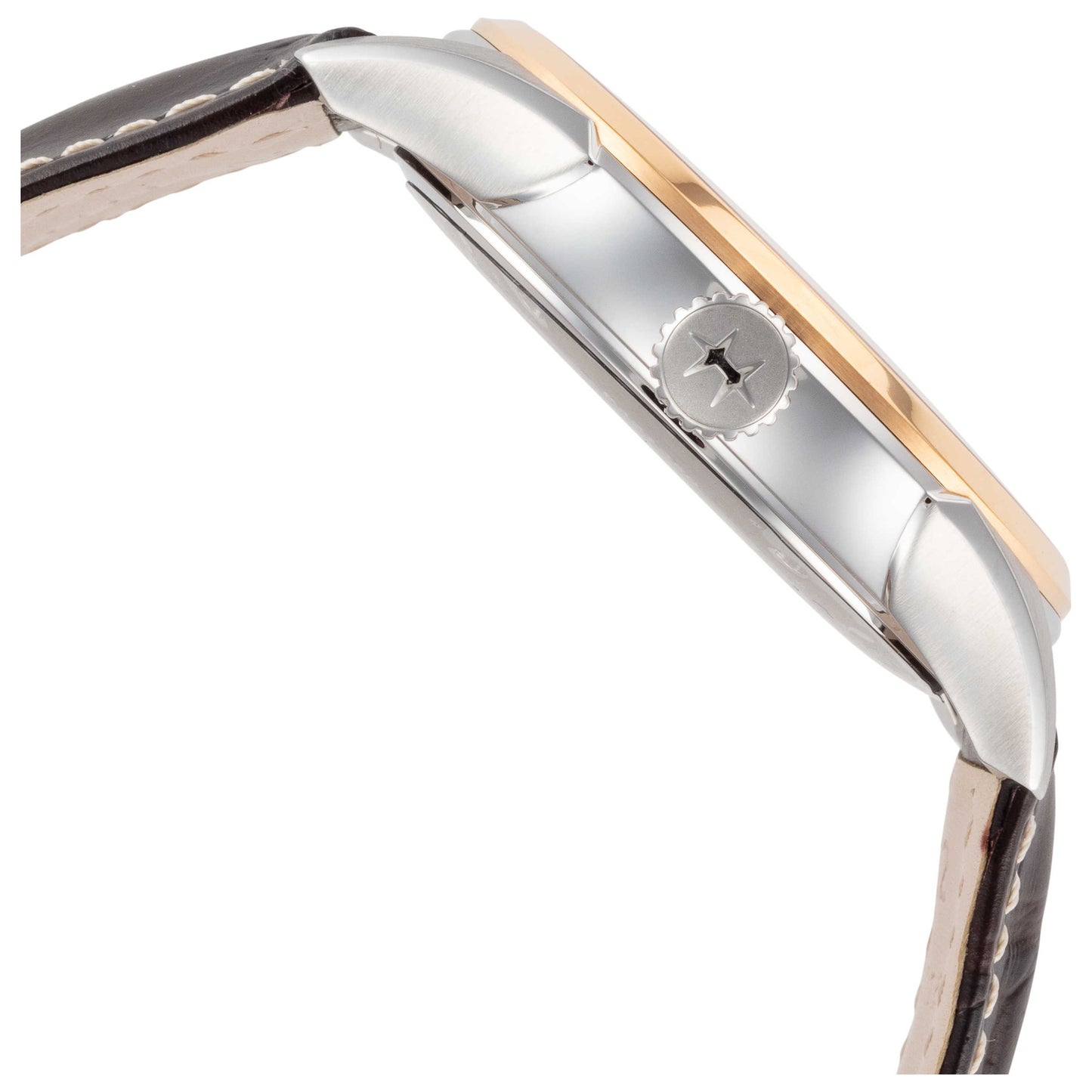 Discover precision Swiss craftsmanship with the Hamilton Jazzmaster Men's Watch. An automatic H-10 Swiss-made movement lies at the heart of this stylish timepiece, ensuring reliability and an impressive 80-hour power reserve. With a date display at 3 o'clock and pull and push crown, this silver-tone round watch showcases a 44mm stainless steel case with an exhibition back. Its silver dial is elegantly protected by scratch-resistant sapphire crystal, while the 50m water resistance ensures durability. A comfortable brown leather bracelet with a secure deployment clasp completes this exceptional accessory. H42725551