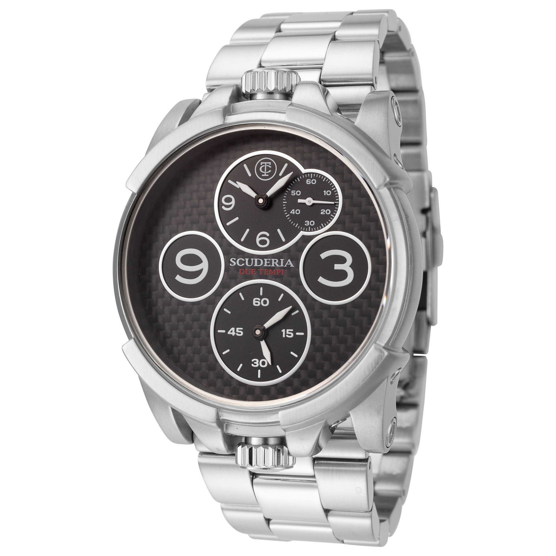 Introducing the CT Scuderia Due Tempi men's watch, a perfect blend of robustness and elegance. This Japanese quartz timepiece is powered by a Miyota 1L45 + Miyota 2025 movement, encapsulated within a 44mm stainless steel case, resistant up to 50m of water. The sleek black dial is covered by a mineral crystal, while the case back remains closed for superior durability. Adjust your time smoothly with the screw-down crown and relish the dual time feature. Complementing the robust case is a silver stainless steel strap, offering a secure fit with a deployment clasp. This CT Scuderia masterpiece is ideal for the man who needs to keep track of two time zones at once. CT-273-P