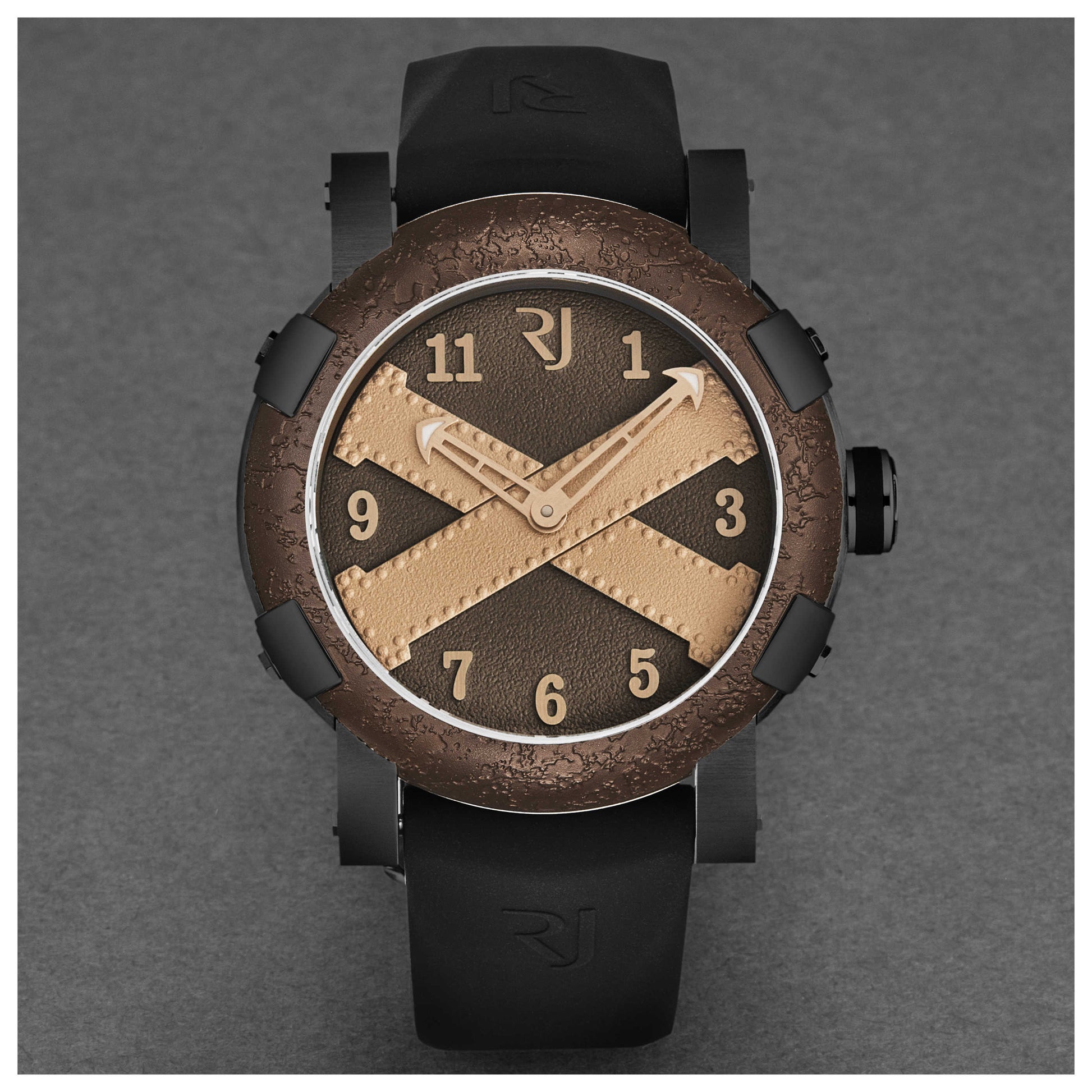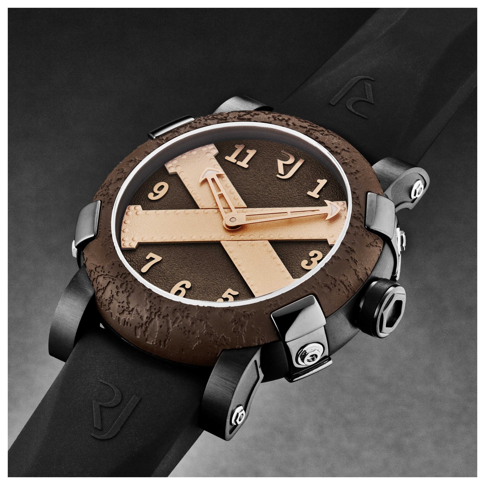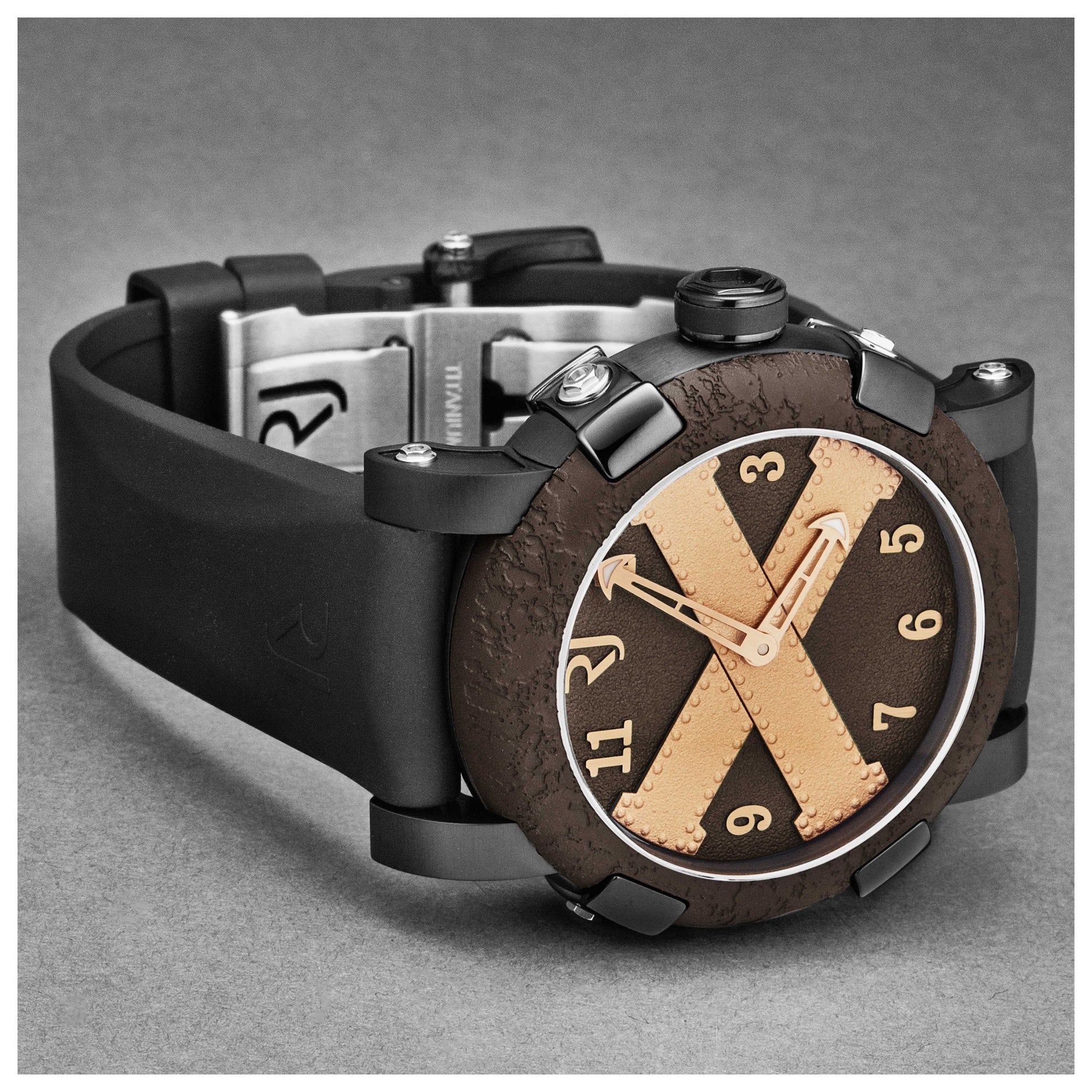 Experience the allure of Swiss engineering with the Romain Jerome Titanic A La Grande men's watch. This remarkable automatic movement timepiece is Swiss-made, featuring a pull and push crown and a closed back for guaranteed durability. Its round 46mm stainless steel case is paired with a brown dial, all encased within a scratch-resistant sapphire crystal. With a water resistance of 30m, this watch is built to withstand minor splashes. Complementing its masculine design, it sports a black rubber strap that closes securely with a deployment clasp. Crafted in Switzerland, this piece exemplifies sophistication. RJTGAU.303.20