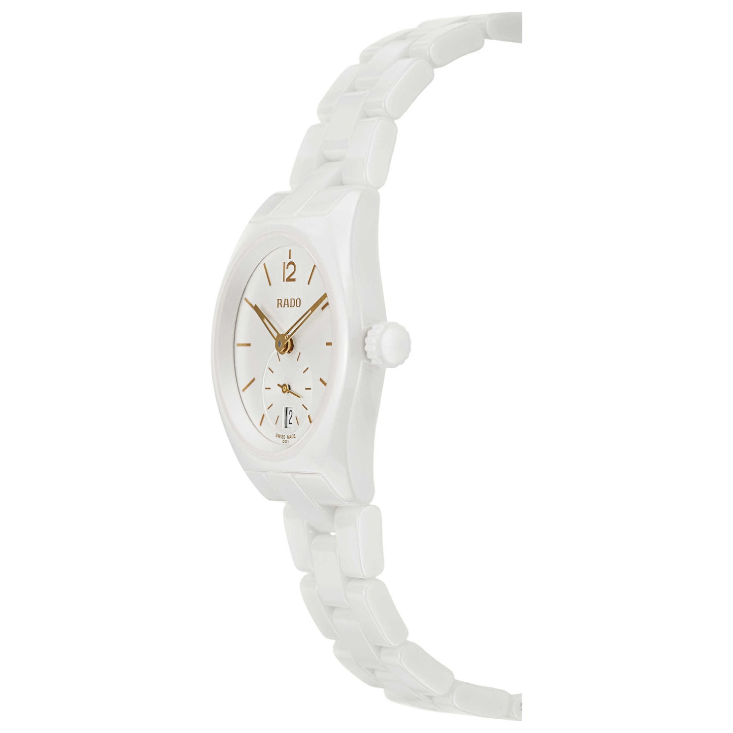 Discover the allure of the Rado True Specchio, a stunning women's watch made in Switzerland. This Swiss-made quartz timepiece is housed in a round titanium and ceramic case of 26.1mm, offering a robust construction and elegant look. It boasts a pull and push crown and a scratch-resistant sapphire crystal, ensuring durability. The silver dial beautifully complements the white titanium and ceramic bracelet, secured by a deployment clasp. A convenient date display at 6 o'clock and water resistance up to 50m make it an exquisite accessory for everyday wear. R27085012