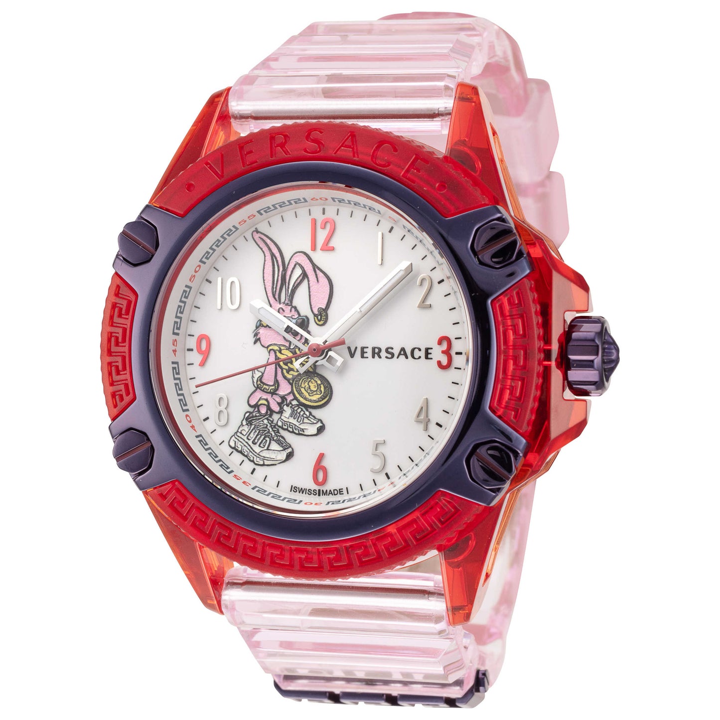 Introducing the Versace Icon Active men's watch, a brilliant example of Swiss-made craftsmanship. Housed within a 42mm red stainless steel case is a precise quartz movement, safeguarded by a scratch-resistant sapphire crystal. The case's round shape is complemented by a white dial and a pink plastic strap, offering a striking contrast. The watch, which is 30m water resistant, secures comfortably on your wrist with a pin buckle. With its pull and push crown and closed case back, it's not just an eye-catching timepiece, it's a testament to Versace's commitment to quality. VE6E00523