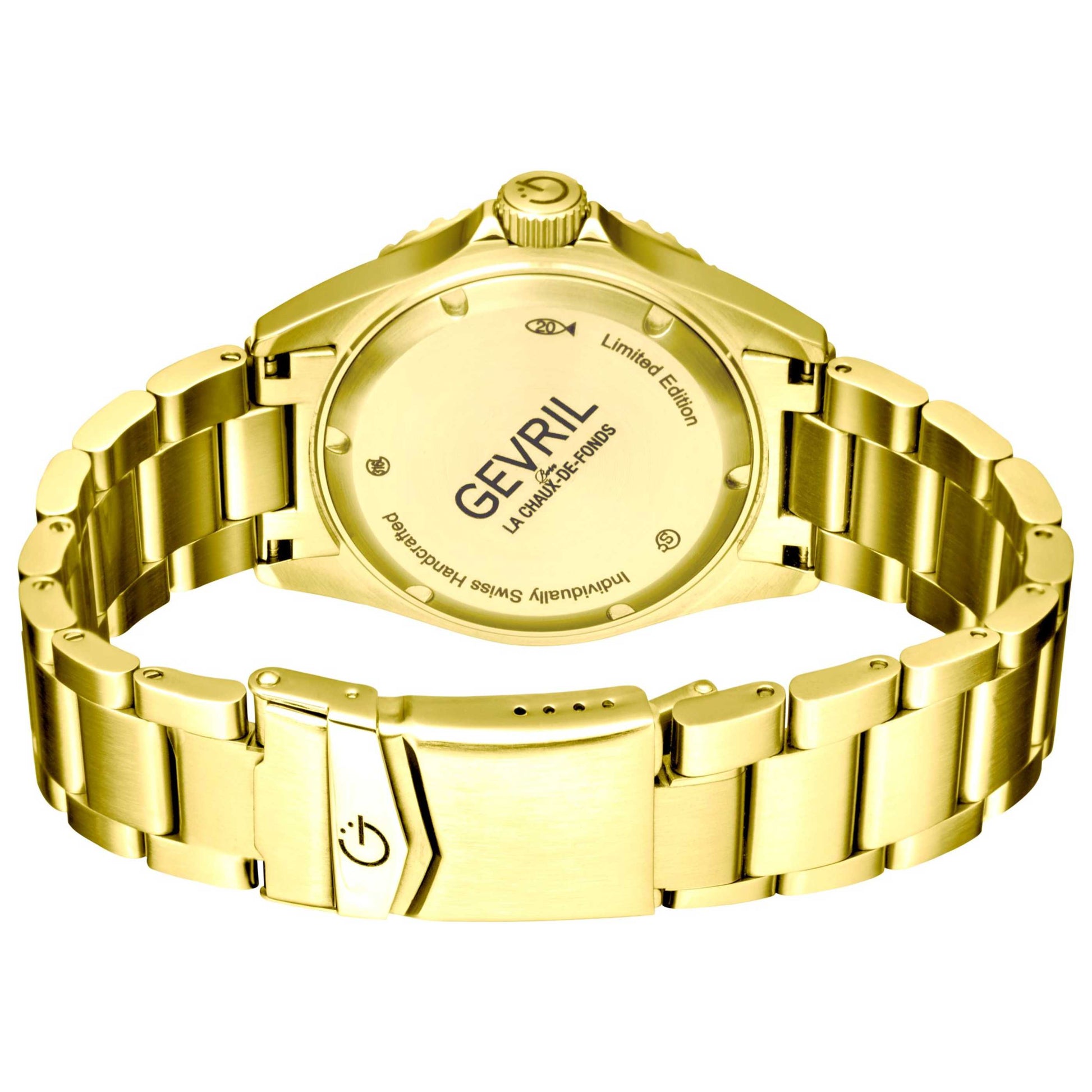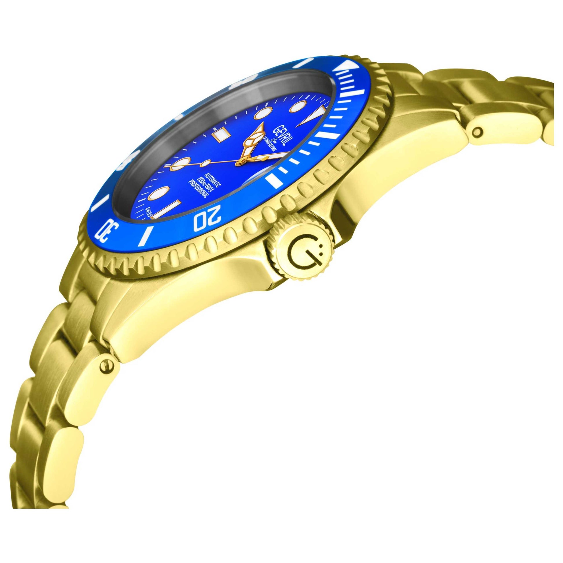 Elevate your attire with the Gevril Wallstreet men's watch, an exemplary fusion of Swiss craftsmanship and modern design. This automatic timepiece features a sturdy 43mm stainless steel case, augmented by a scratch-resistant, anti-reflective sapphire crystal for lasting durability. The vibrant blue dial showcases the date feature, encased within a round case with a screw-down crown. This watch's water resistance stands up to 200m, ensuring reliable performance in various conditions. Wrapping up this piece's distinguished look is a gold stainless steel bracelet secured with a deployment clasp, underlining its robust charm. 4854A