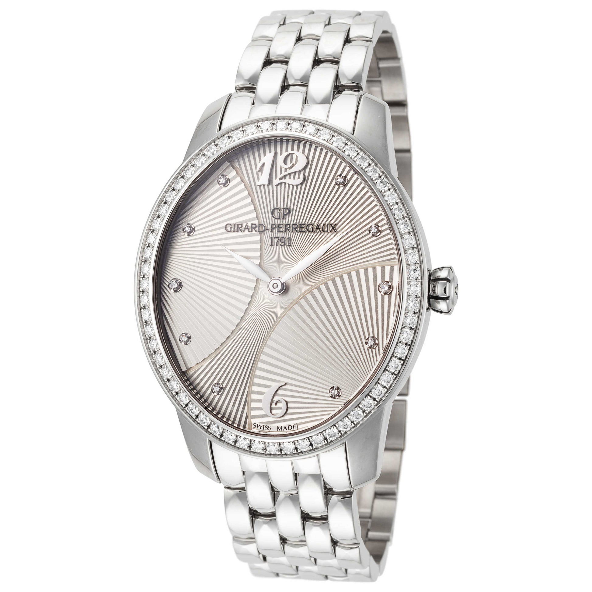 Experience the luxury of the Swiss-made Girard-Perregaux Cat's Eye women's watch. The automatic GP03300-0120 movement has a substantial power reserve of 46 hours and is housed in an exquisite 34.6mm stainless steel oval case with a stunning diamond bezel. The silver dial, under a scratch-resistant sapphire crystal, pairs elegantly with the black stainless steel bracelet secured by a deployment clasp. This sophisticated timepiece, with a water resistance of up to 30m and an exhibition back, demonstrates both the beauty and resilience in Girard-Perregaux's craftsmanship. 80493D11A161-11A
