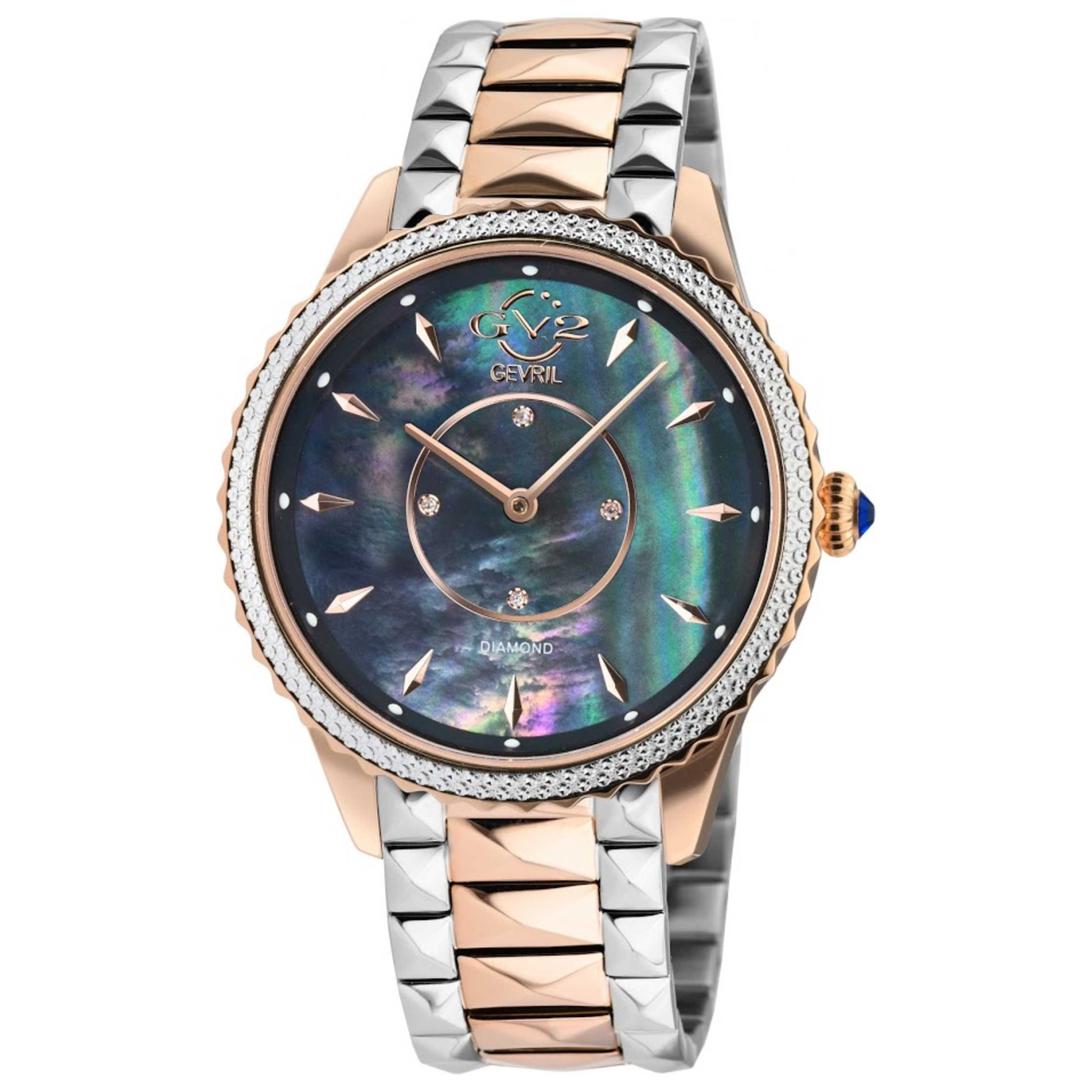 Introducing the GV2 by Gevril Siena watch, a Swiss-made quartz timepiece specifically designed for women. The round stainless steel case measuring 38mm in width houses a stunning blue mother-of-pearl dial protected by a scratch-resistant, anti-reflective sapphire crystal. The watch includes a pull and push crown and a closed case back, providing water resistance up to 30m. This piece is complemented by a stylish silver and rose gold stainless steel bracelet, which secures effortlessly with a deployment clasp. Delicate yet robust, the Siena watch blends form and function beautifully. 11705-425