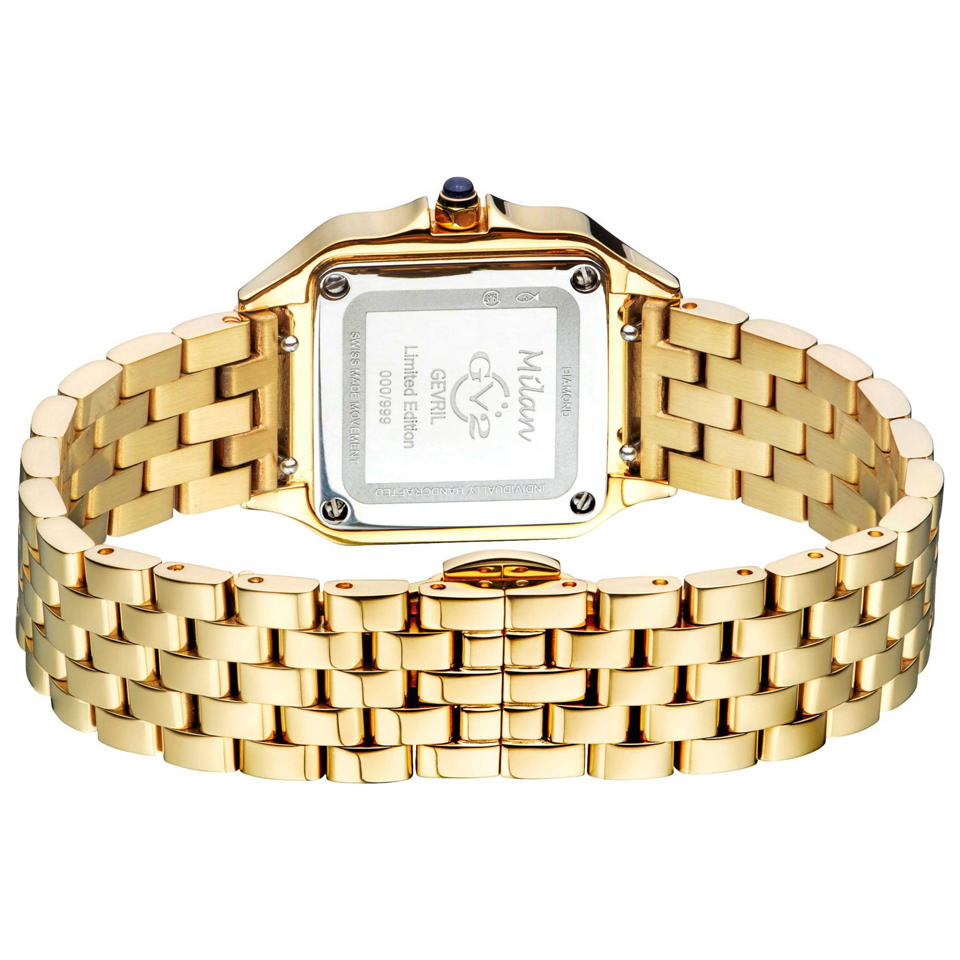 Step up your style game with the GV2 by Gevril Milan watch, a Swiss-made fashion statement for the sophisticated woman. This quartz movement timepiece is skillfully crafted with a square stainless steel case of 27.5mm, wrapped around a delicate white dial, enclosed by a scratch-resistant anti-reflective sapphire crystal. The pull and push crown provides user-friendly functionality, while a water resistance of 50m ensures durability. Completing the watch is a luxurious gold stainless steel bracelet secured by a deployment clasp, blending fashion with practicality. 12112B