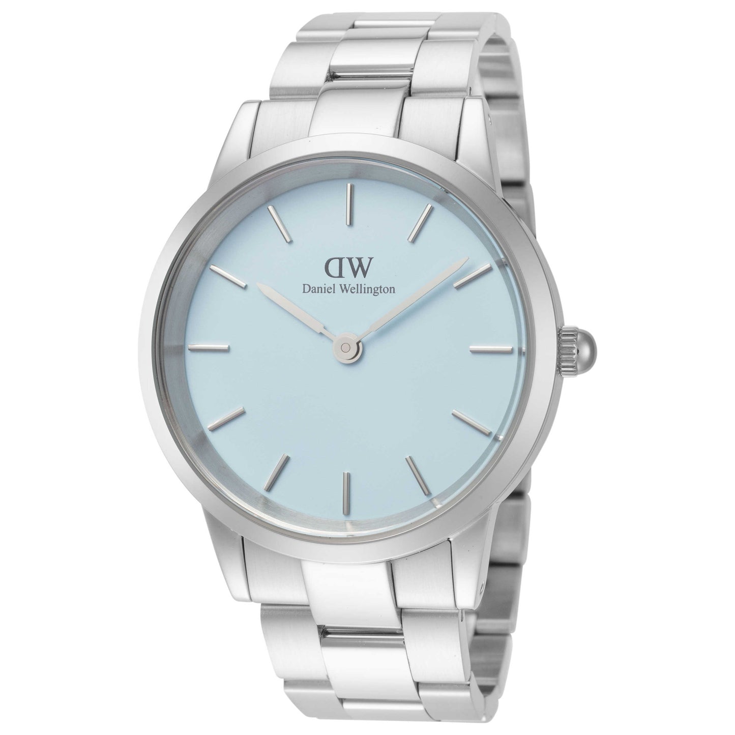 Discover timeless elegance with the Daniel Wellington Iconic women's watch. This Japanese quartz movement timepiece is encased in a 32mm round stainless steel case, boasting a charming light blue dial under durable mineral crystal. The pull and push crown and 30m water resistance ensure reliability. The silver stainless steel bracelet, complete with a deployment clasp, adds a sophisticated finish to this exquisite piece from the Iconic collection. DW00100541