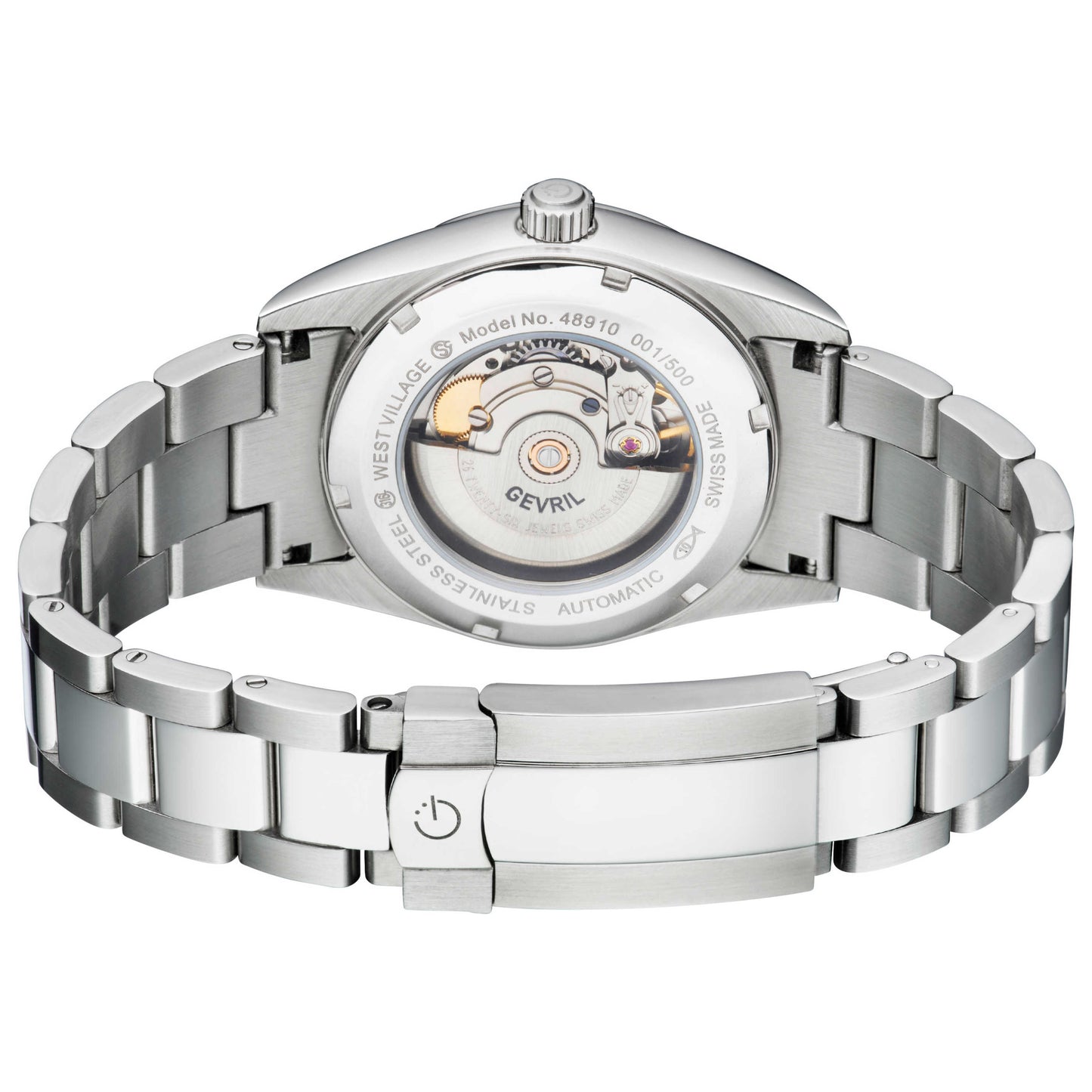 Introduce the sleek sophistication of the Gevril West Village men's watch, a Swiss-made marvel for the modern man. This automatic timepiece sports a 40mm stainless steel case with an exhibition back, enclosed by a scratch-resistant, anti-reflective sapphire crystal. The vibrant yellow dial features a date function, all secured by a screw-down crown. This watch promises an impressive water resistance of up to 100m. The silver stainless steel bracelet seamlessly blends with the overall design and ensures a snug fit with its deployment clasp. Experience the reliable functionality of Swiss movement in this distinguished timepiece. 48910