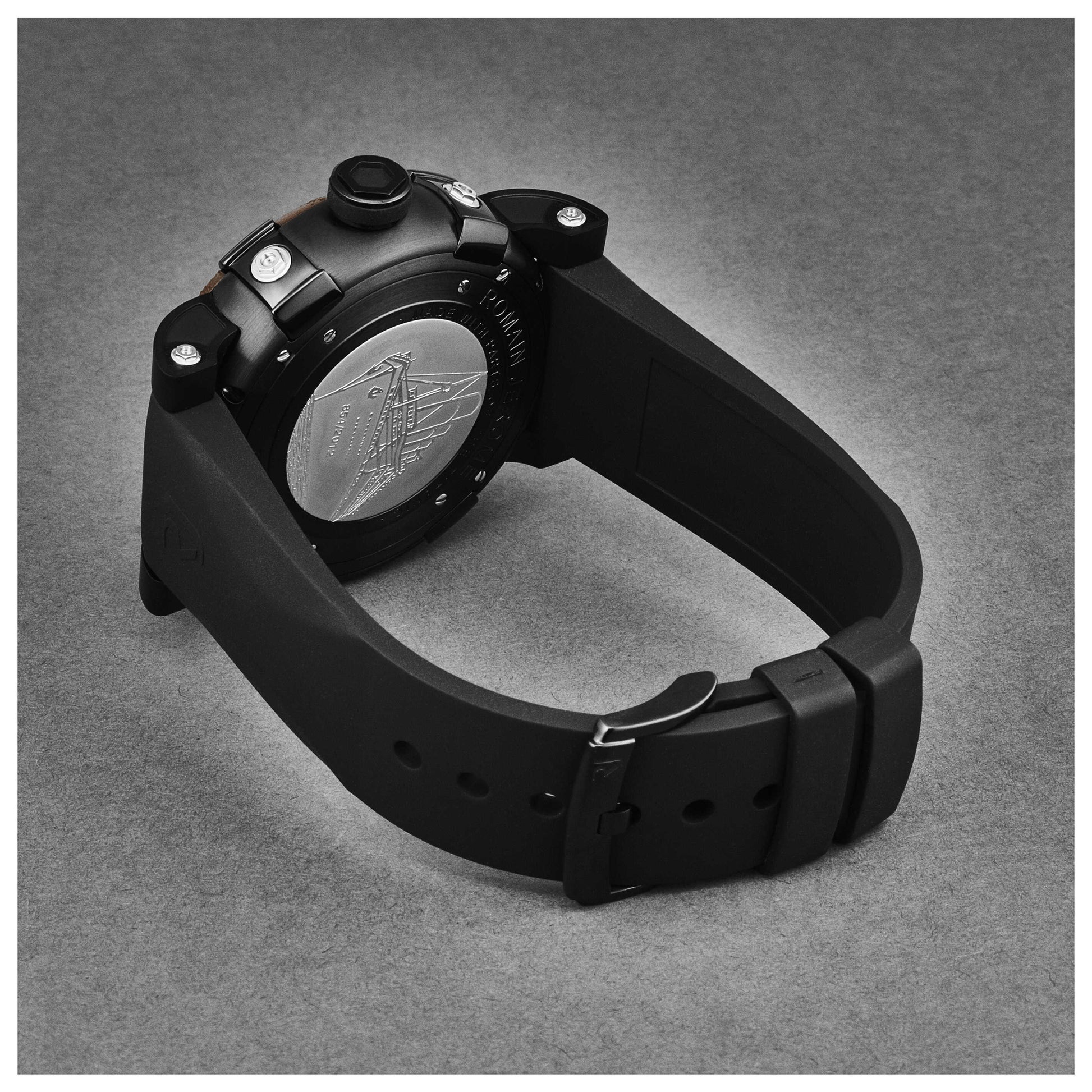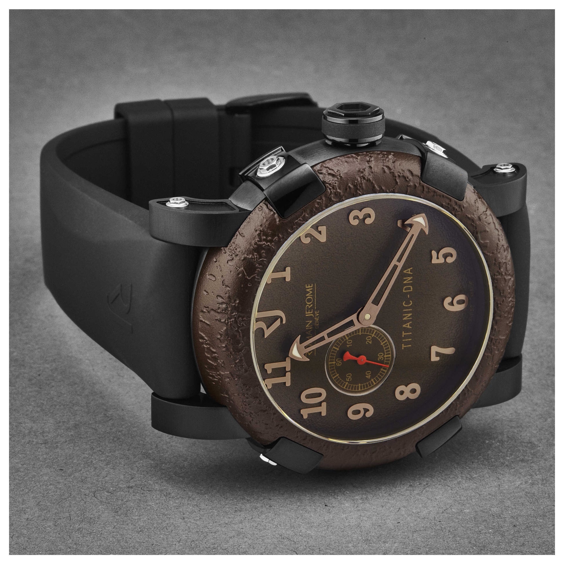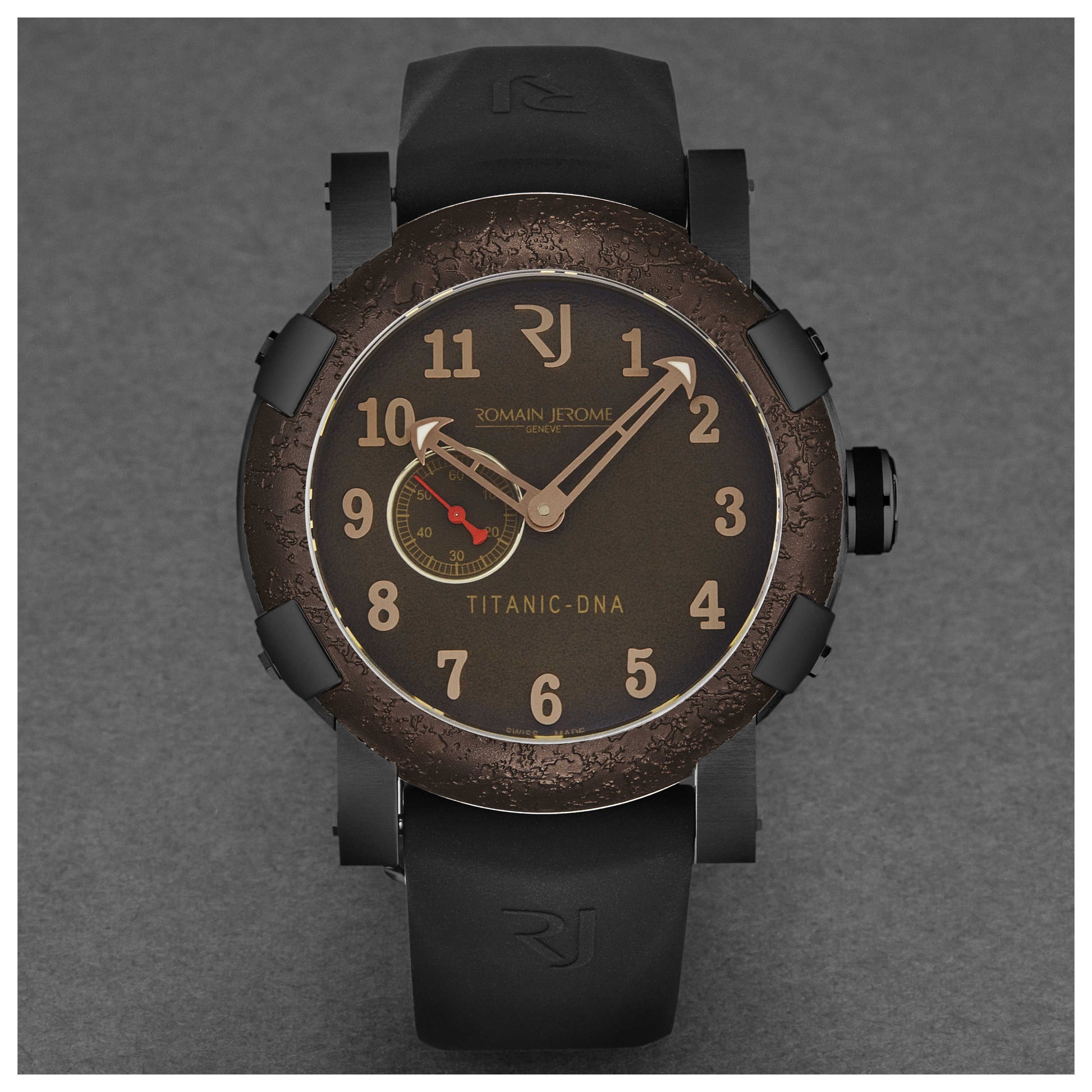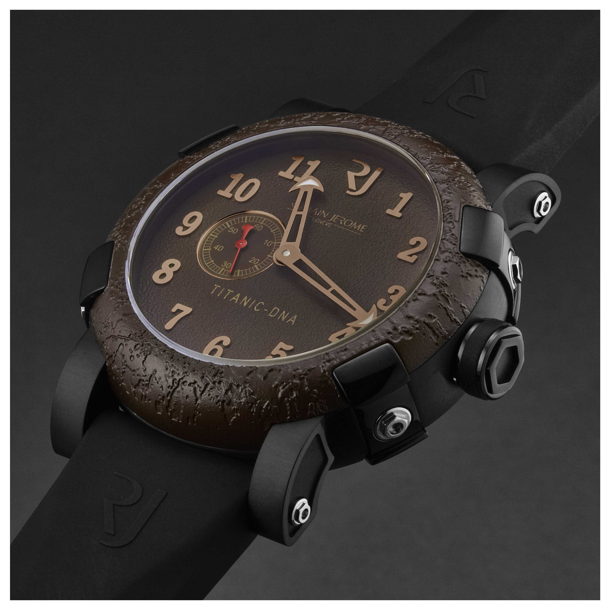 Showcase your timeless style with the Romain Jerome Titanic men's watch. Crafted in Switzerland, this automatic timepiece is housed in a 46mm black stainless steel case, providing a bold contrast to its brown dial. The case, sealed with a scratch-resistant sapphire crystal and a closed back, offers up to 30m of water resistance. A pull and push crown complements the Swiss-made movement for accurate timekeeping. The watch comes with a black rubber strap, providing comfort and durability, secured with a pin buckle. This round watch from the Titanic collection echoes an era of elegance and resilience. RJTIAU.303.20