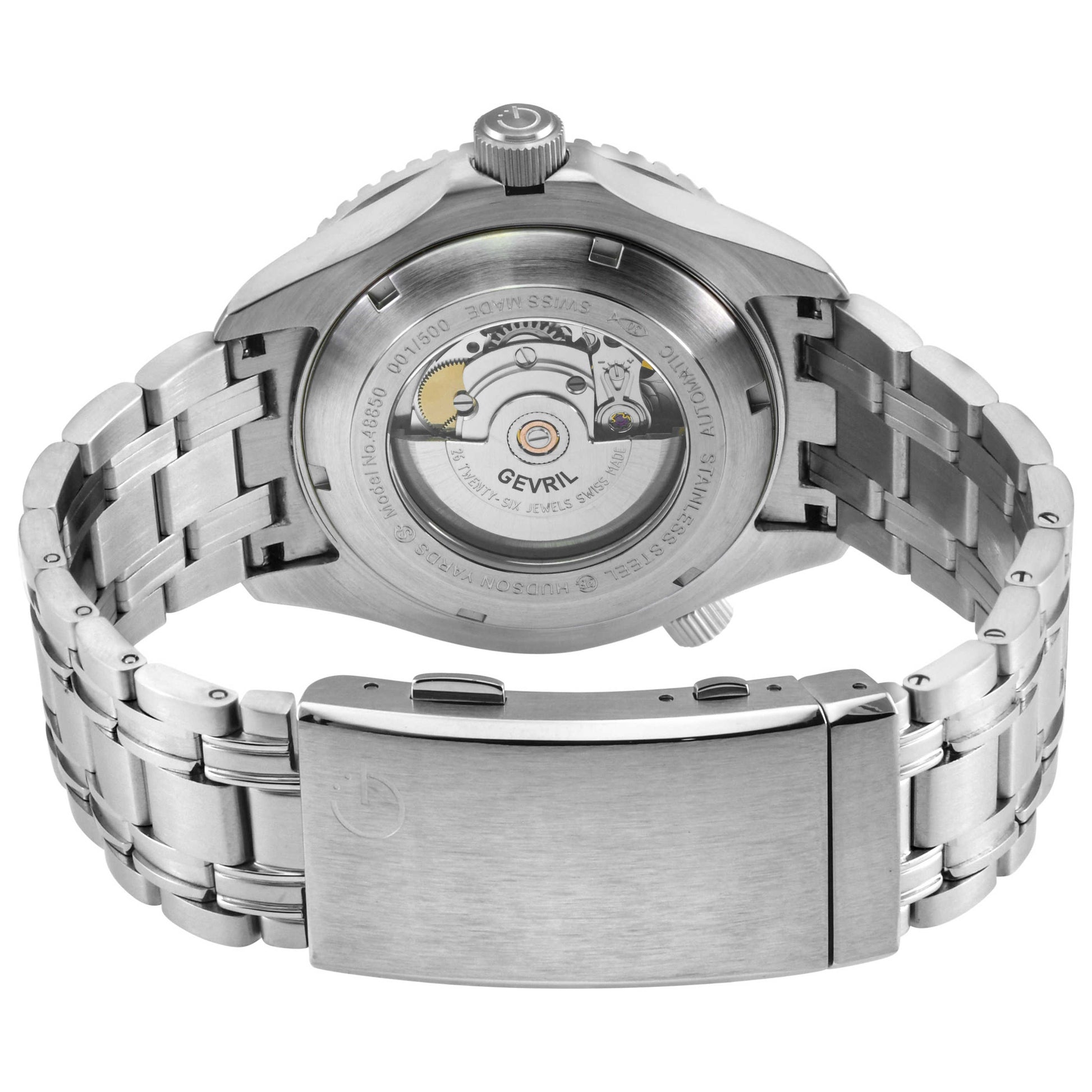 Discover the Swiss precision and craftsmanship of the Gevril Hudson Yards men's watch. This robust automatic timepiece features a 43mm round stainless steel case coupled with a sophisticated black dial under an anti-reflective, scratch-resistant sapphire crystal. Thanks to its screw-down crown and exhibition case back, the watch stands out while offering a water resistance of 330m. The silver stainless steel bracelet provides a secure fit with a deployment clasp, complementing the overall robust yet stylish appeal of this Swiss-made masterpiece. 48850B
