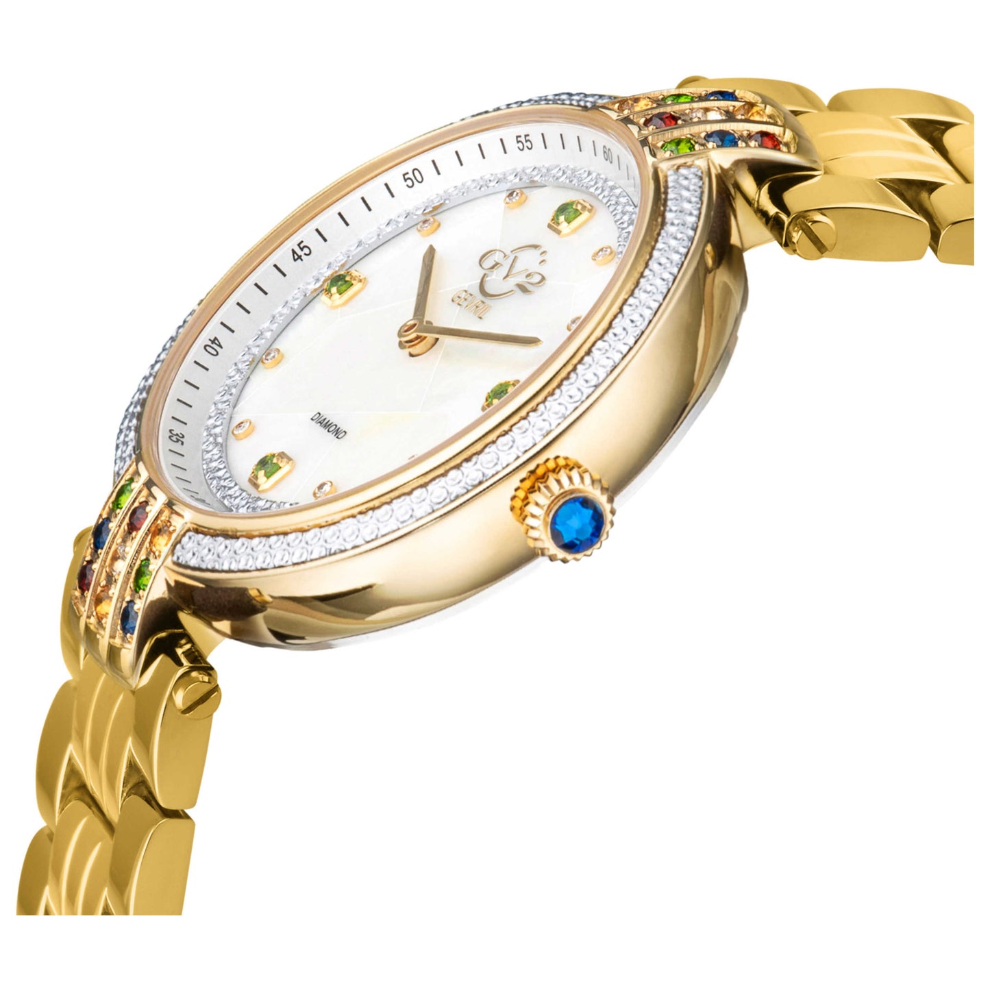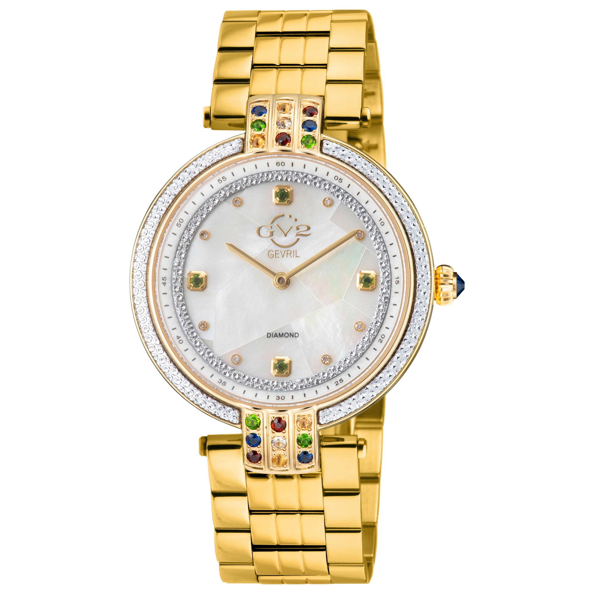 Embrace timeless elegance with the GV2 by Gevril Matera watch, a distinct piece designed for women who appreciate sophistication. Crafted in Switzerland, this round quartz timepiece comes in a 35mm stainless steel case with a stunning white mother-of-pearl dial, protected by scratch-resistant sapphire crystal. It offers a pull and push crown and a secure closed back, boasting a water resistance of up to 50m. The gold stainless steel bracelet rounds off its classy appeal, securely fastening with a deployment clasp. This Swiss-made accessory combines style and durability, making it a perfect everyday companion. 12803B
