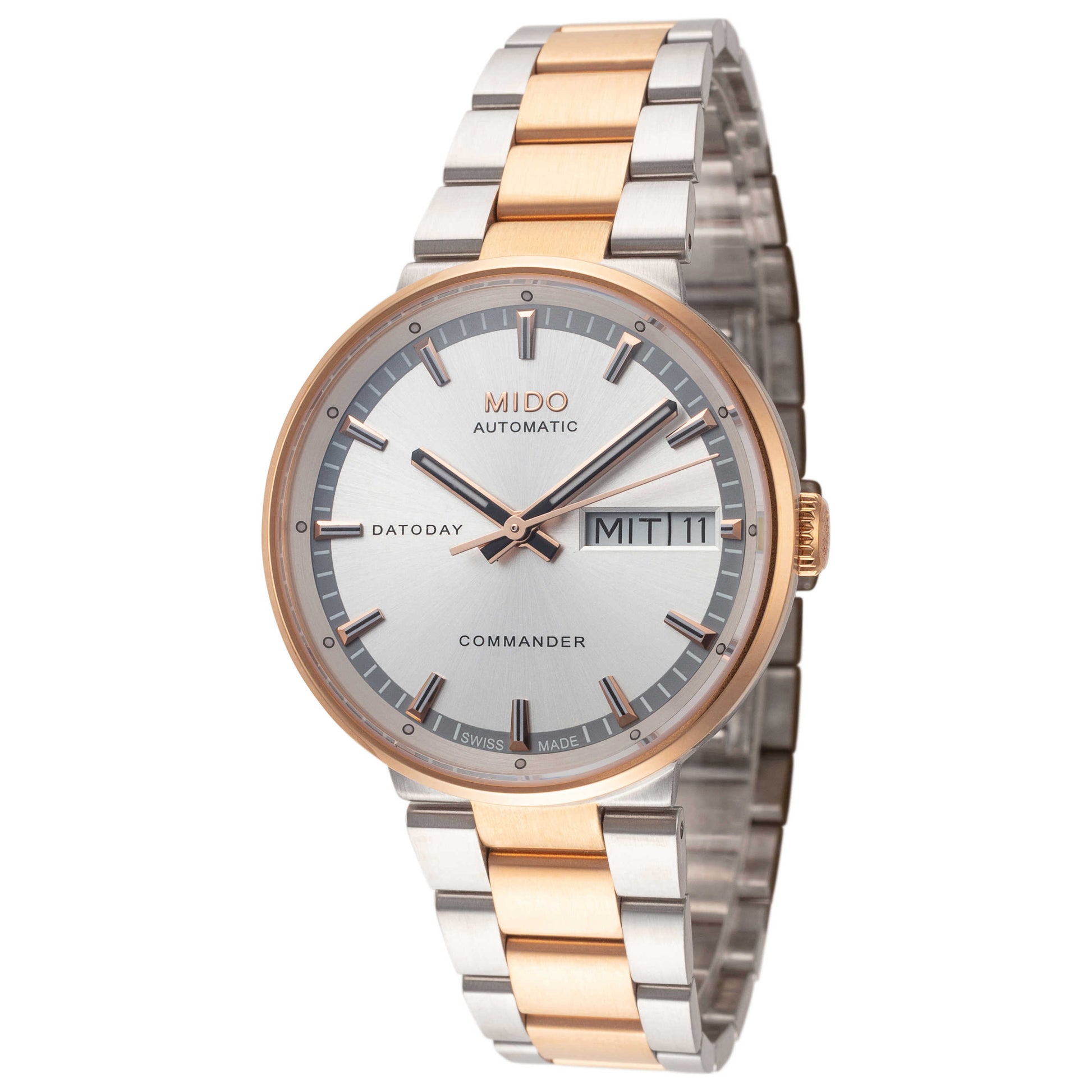 Experience timeless elegance with the Mido Commander women's watch, a Swiss-made masterpiece from the prestigious brand. This automatic watch, encased in a 33mm round, rose gold PVD stainless steel case, ensures durability and style. The silver dial subtly showcases the date at 3 o'clock, shielded by a scratch-resistant sapphire crystal. Its two-tone stainless steel bracelet adds a sophisticated finish, securely fastened with a deployment clasp. This watch is water-resistant up to 50m, providing practicality for the modern woman. With its closed back and Swiss-made movement, this piece promises precision and longevity. M0142302203180