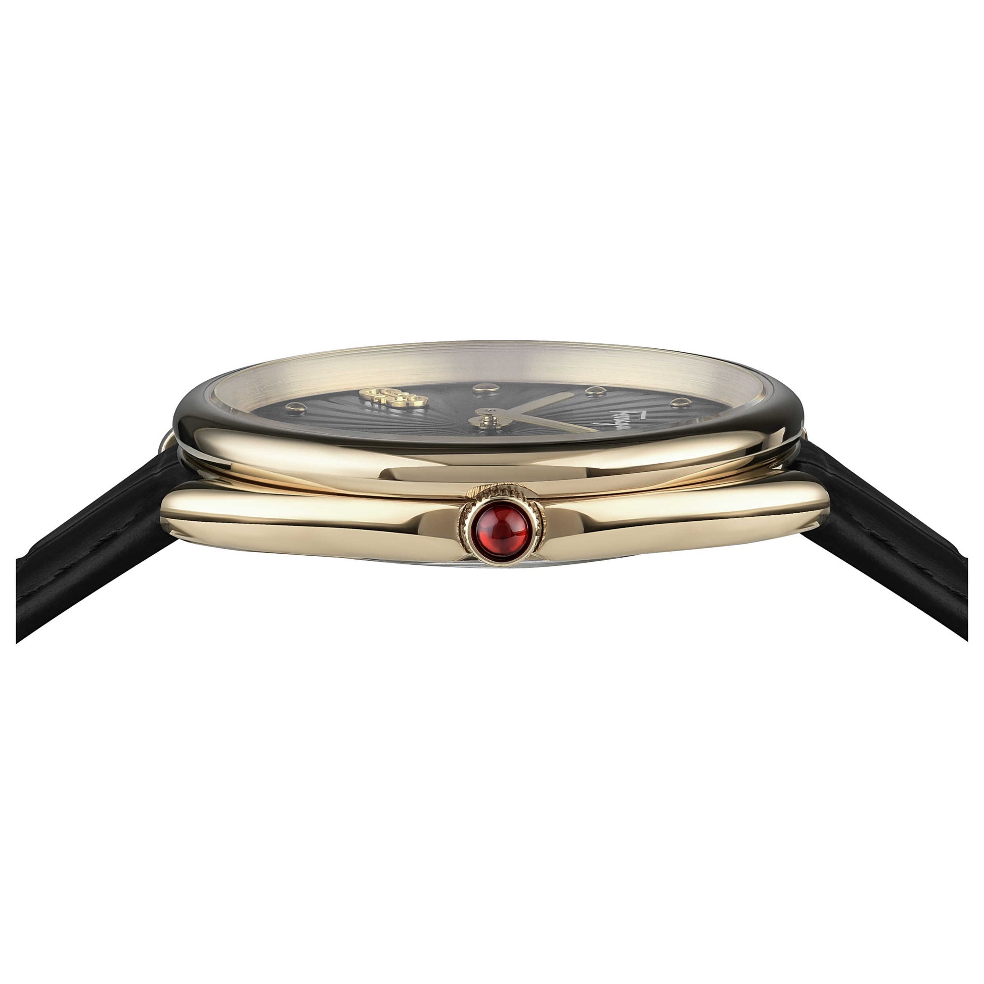 Elevate your elegance with the Ferragamo Cuir watch, an opulent Swiss-made accessory perfect for the sophisticated woman. This women's timepiece, designed in Switzerland, features a reliable quartz movement enclosed in a gold tone round stainless steel case measuring 34mm. It houses a sleek black dial beneath a scratch-resistant sapphire crystal. The pull and push crown aids in time adjustment, while its 50m water resistance lends durability. Coupled with a plush black leather strap that secures with a deployment clasp, this watch exudes unmatched grace and class. SFYN00420