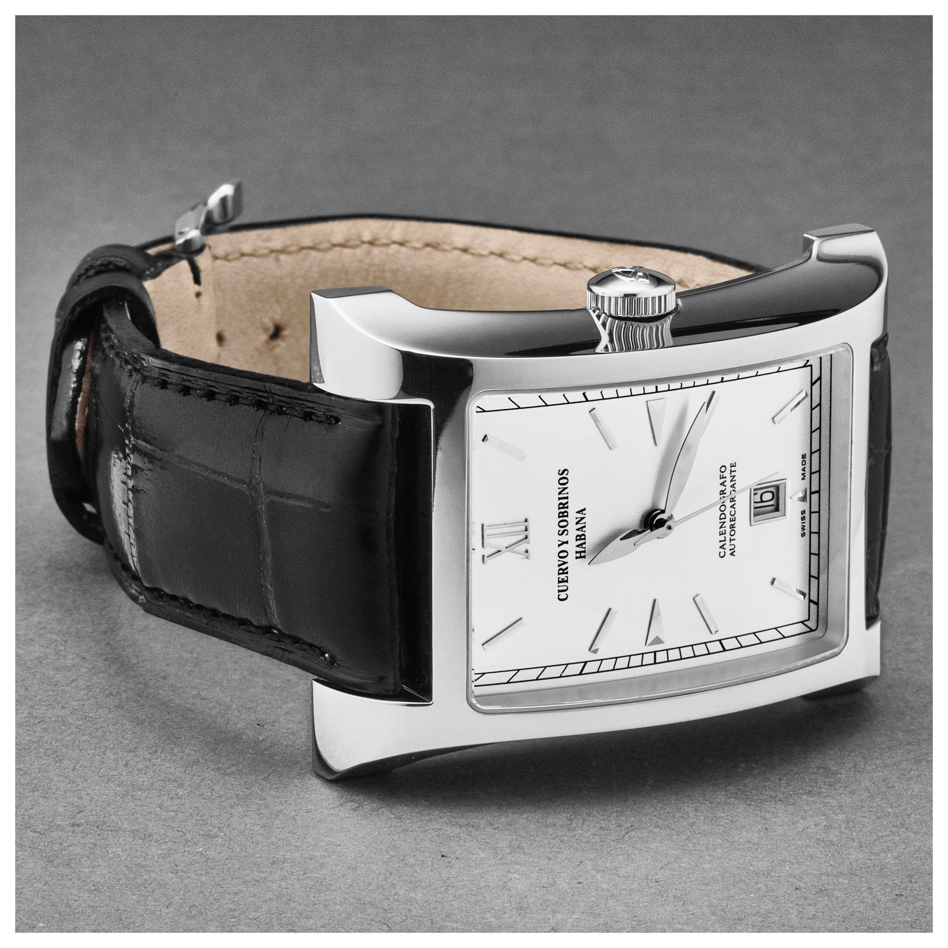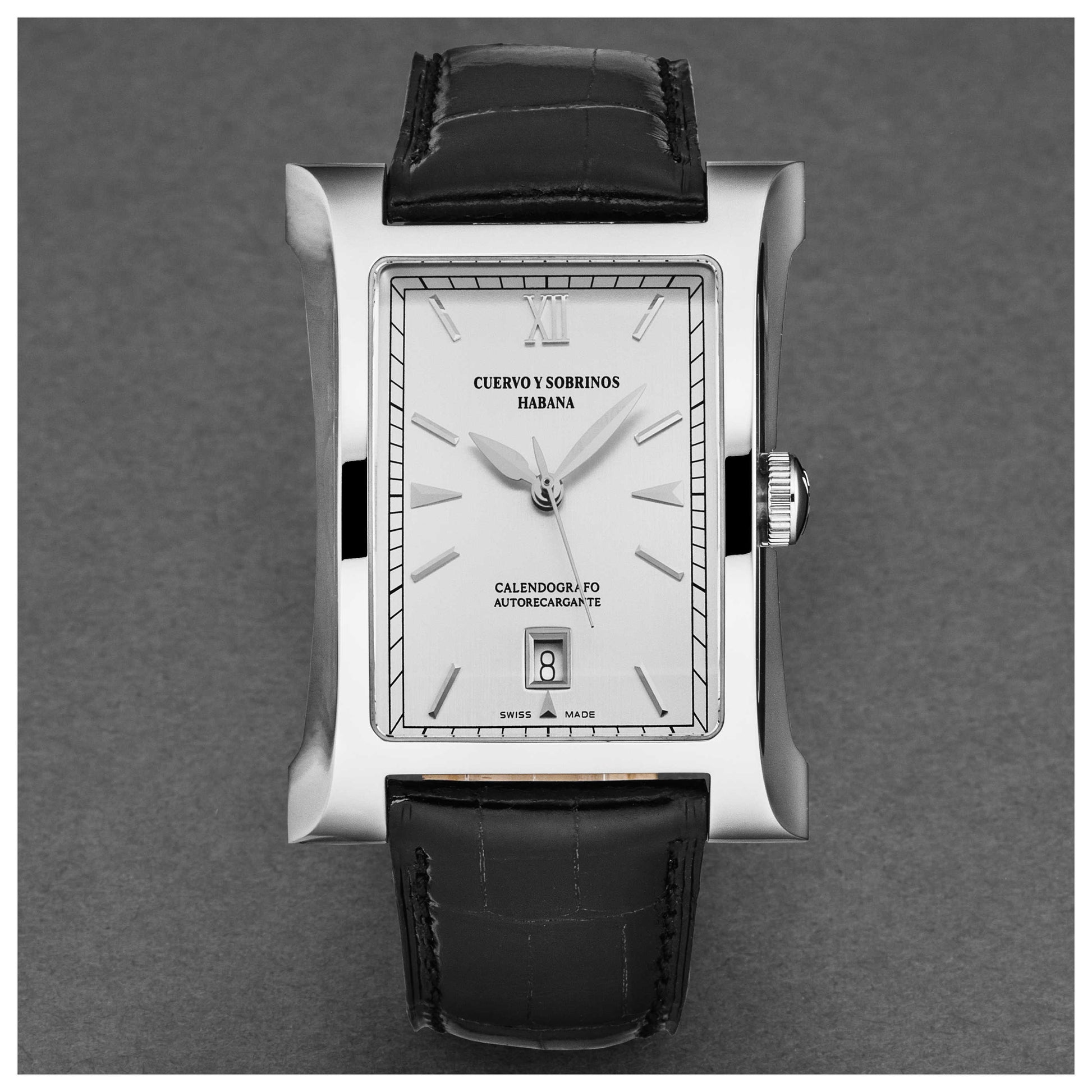 Indulge in the sophisticated style of the Cuervo y Sobrinos Espléndidos 1882 men's watch, a testament to Swiss craftsmanship. This automatic, Swiss-made piece features a rectangular 35mm stainless steel case with an exhibition back, tastefully highlighting its mechanical prowess. The pull and push crown, paired with a 30m water resistance, promises functionality in every environment. The elegant silver dial, encased in scratch-resistant sapphire crystal, tastefully hosts a practical date feature. Complementing the watch's refined aesthetic, a black leather strap, secured by a pin buckle, ensures both comfort and style. Crafted in Switzerland, this timepiece is the epitome of distinguished elegance. 2412.1ABS
