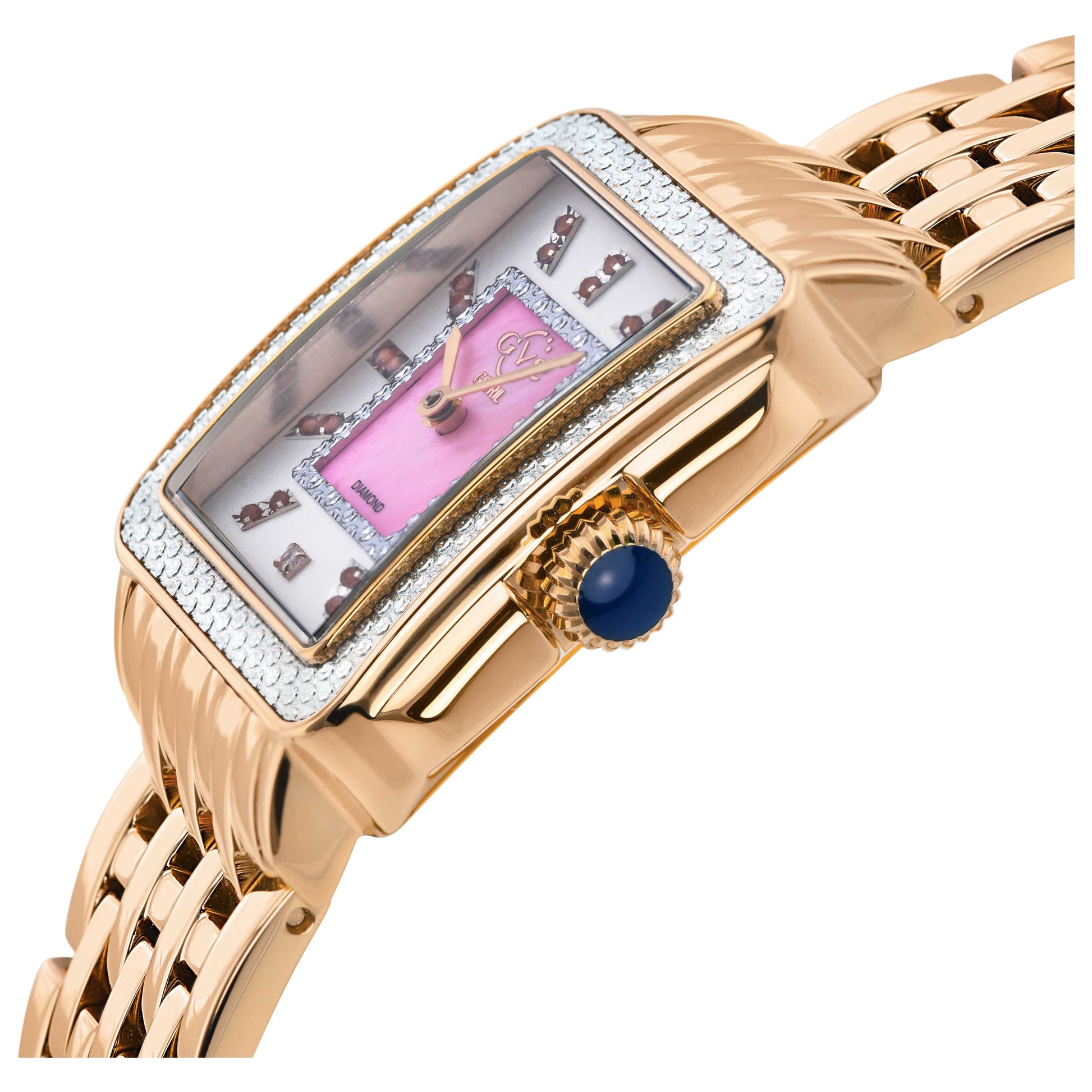 Showcase your elegance with the GV2 by Gevril Padova Gemstone women's watch, an exquisite piece of Swiss craftsmanship. Encased within a 30mm rectangular stainless steel body, this Swiss-made quartz watch features a radiant pink mother-of-pearl dial, protected by a scratch-resistant and anti-reflective sapphire crystal. With a pull and push crown and a closed back, it offers water resistance up to 50m. The rose gold stainless steel bracelet, secured with a deployment clasp, adds a luxurious touch, cementing this timepiece as a stylish must-have. 12336B