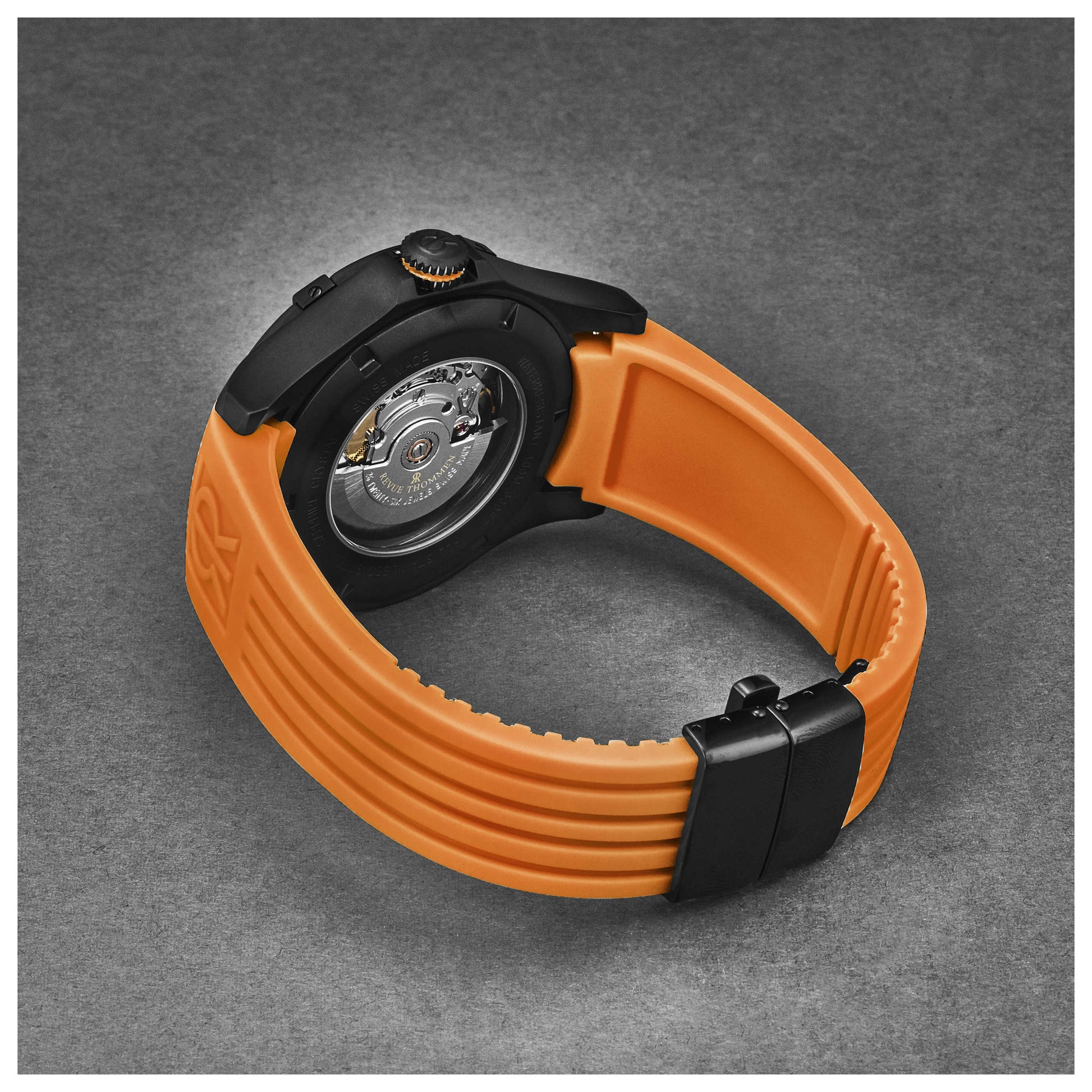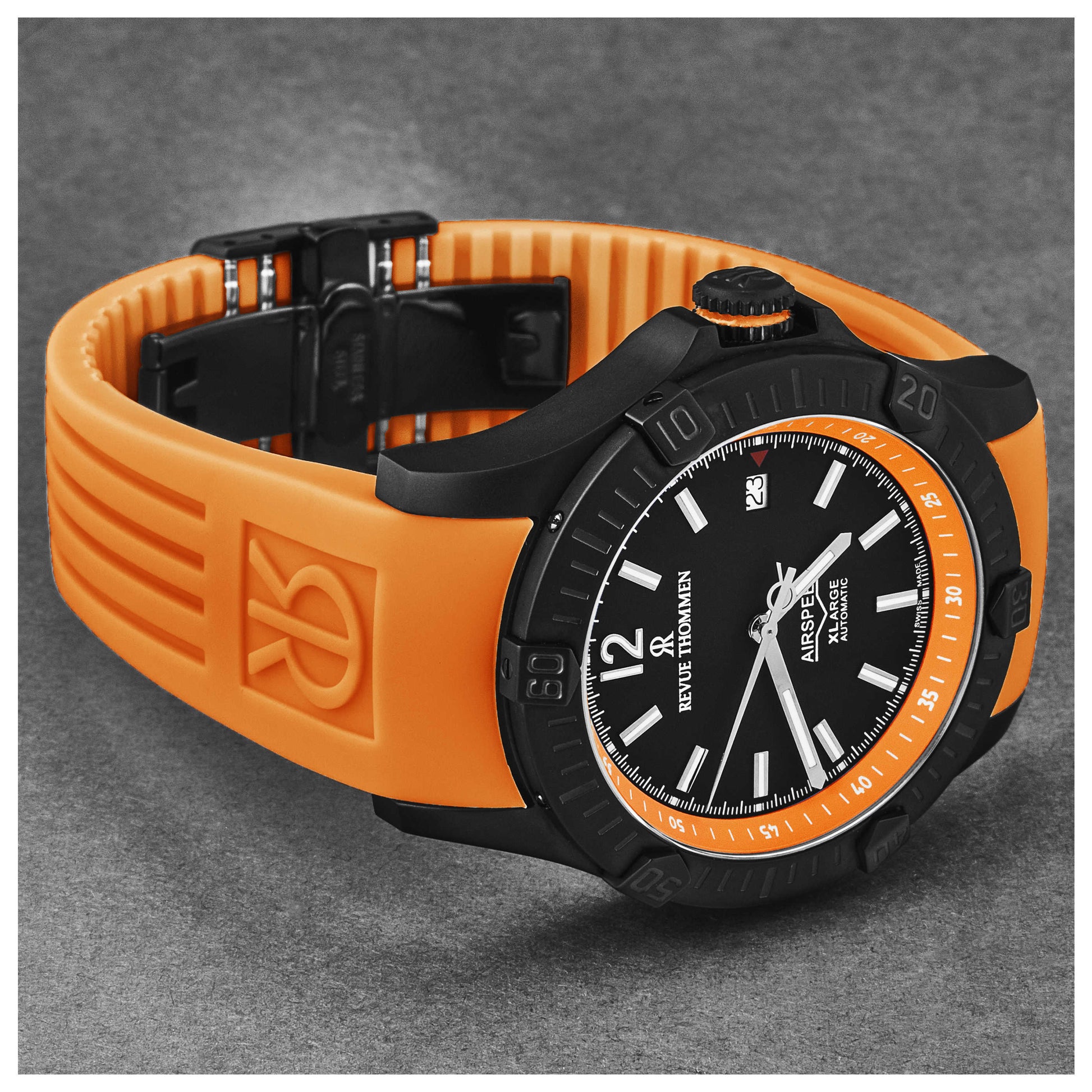 Elevate your look with the Revue Thommen Air Speed watch, a sophisticated piece for the modern man. This Swiss-made automatic movement watch features a rugged stainless steel case of 43.5mm diameter, housing a striking black dial under a scratch-resistant sapphire crystal. Its unique attributes include an exhibition case back and a screw-down crown. With a water resistance up to 100m, it's perfect for adventurous spirits. The watch also showcases a date feature at 3 o'clock for added convenience. An orange rubber strap with a deployment clasp adds a pop of color, bringing this masterpiece to completion. 16070.4679