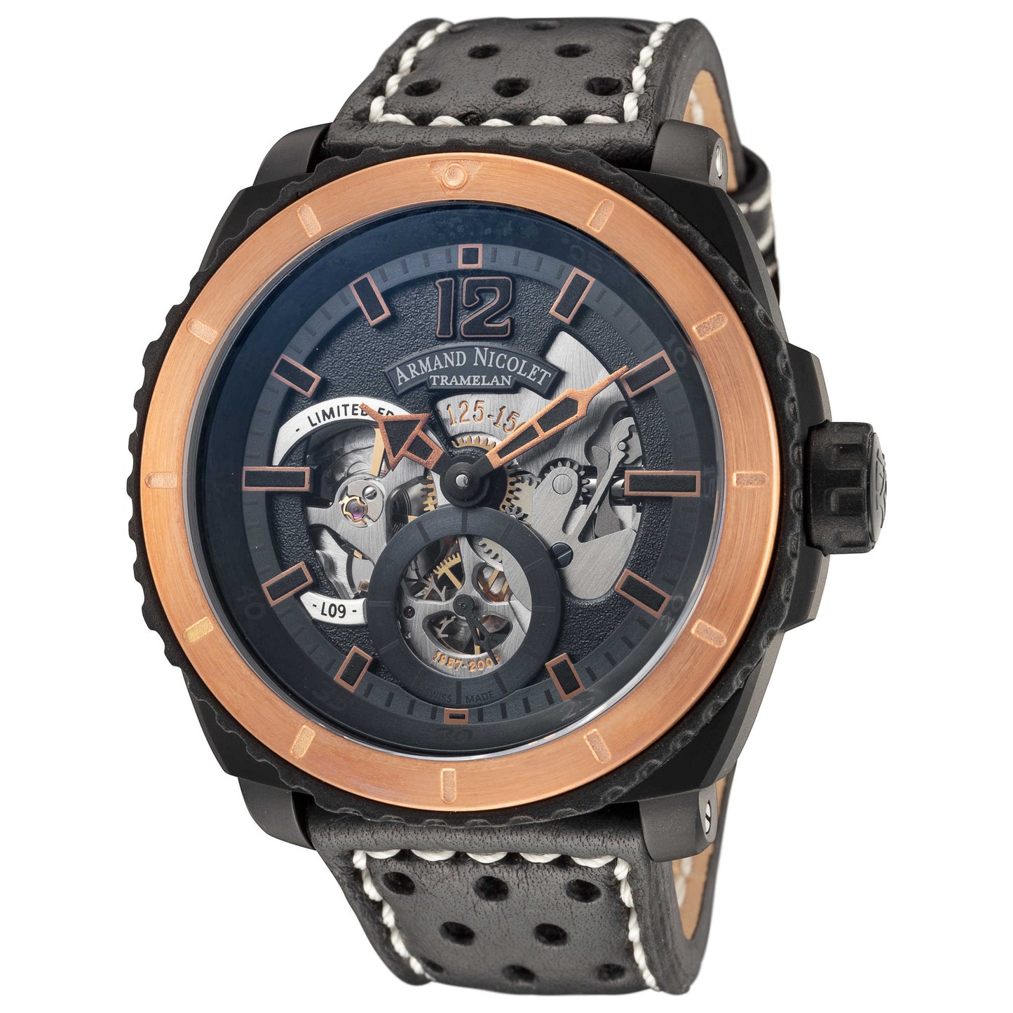 Armand Nicolet, L09, Men's Watch, Titanium DLC Coated Case, Leather Strap, Swiss Mechanical Manual (Hand-Winding), S619AQN-BU-P160N