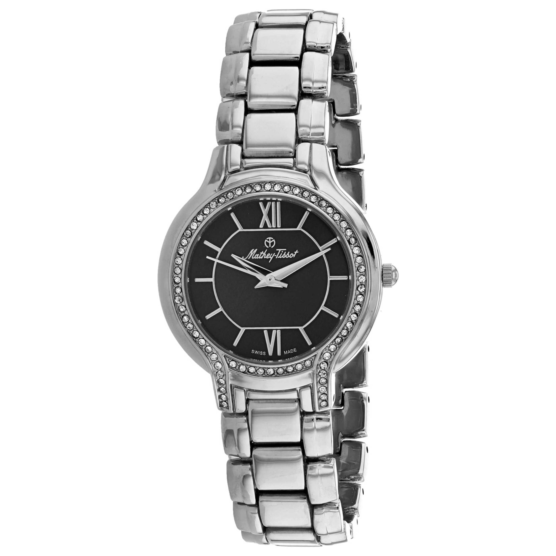 Indulge in the elegance of the Mathey Tissot Classic women's watch, a fine Swiss-made timepiece that radiates sophistication. This Quartz movement watch boasts a round 28mm stainless steel case featuring a stunning black dial, protected by scratch-resistant sapphire crystal. Its pull and push crown facilitates easy time adjustments, while the case offers water resistance up to 50m, ideal for daily use. Complementing the case is a silver stainless steel bracelet with a secure jewelry clasp, offering both durability and style in a single package. D2781AN