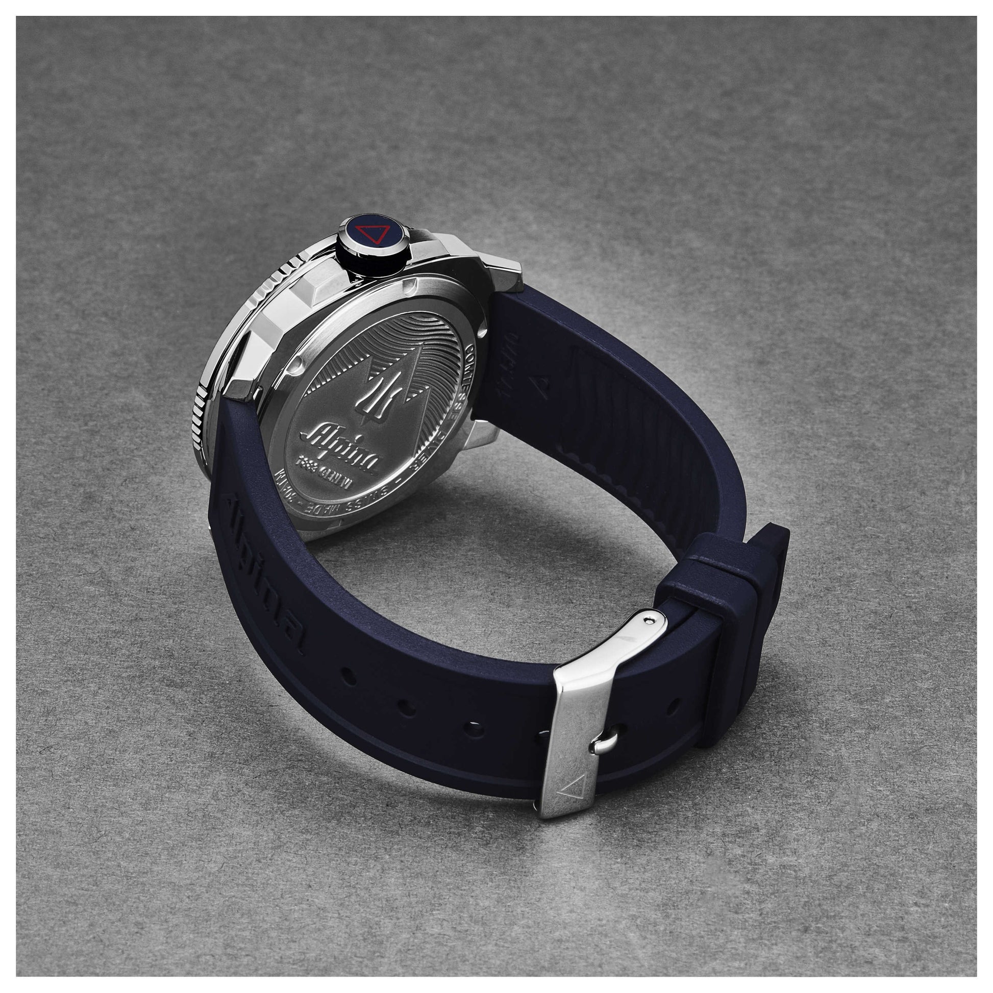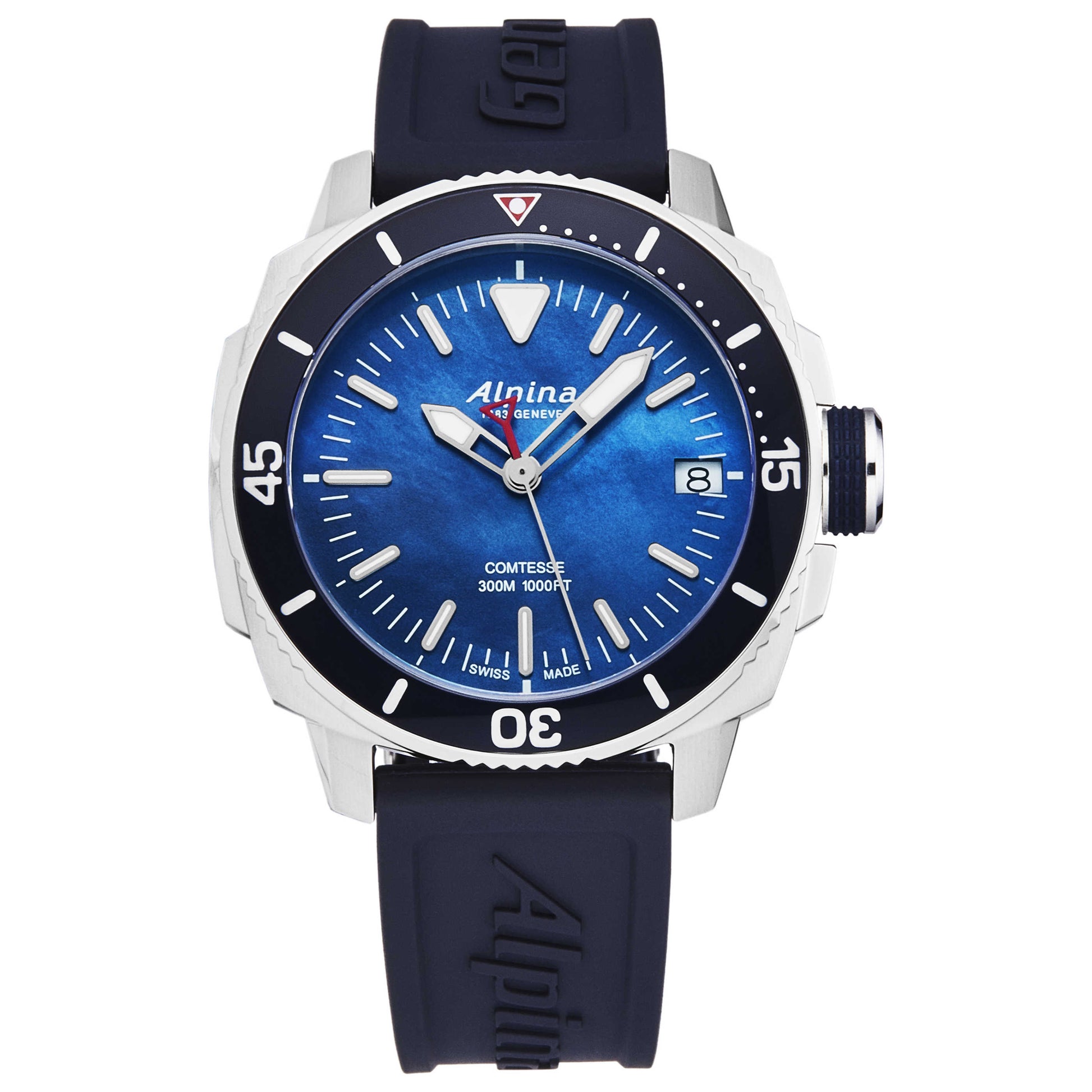 Introducing the Alpina Comtesse, a Swiss-made watch designed for the modern woman. This round quartz timepiece boasts a 34mm stainless steel case, tastefully paired with a vibrant blue dial, protected by a scratch-resistant sapphire crystal. It features a secure screw-down crown and an impressive water resistance of up to 300m. Stay up to date with its useful date feature. The blue rubber strap provides a comfortable fit, secured by a pin buckle for everyday wear. With its closed case back, this watch balances elegance and durability seamlessly. AL240MPN2VC6