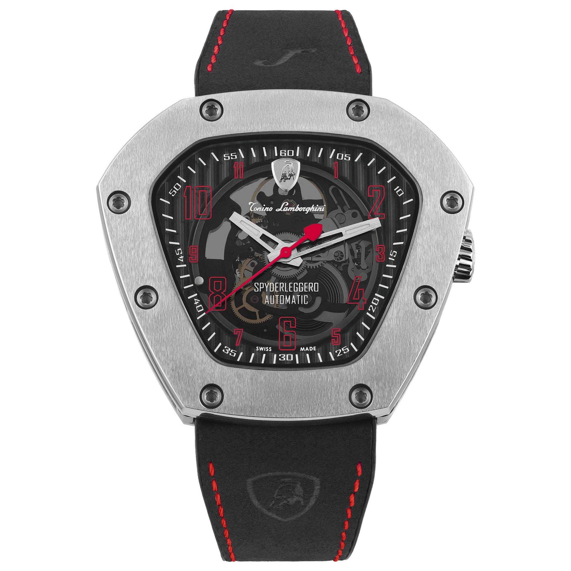 Exude sophistication with the Tonino Lamborghini Spyderleggero men's watch, an exceptional Swiss-made timepiece that reflects high-class luxury. Its automatic movement boasts a 38-hour power reserve and a pull and push crown. Enclosed within a unique 51.5mm titanium case, the black dial sits protected under scratch-resistant sapphire crystal. The case, with an exhibition back, offers a robust water resistance of 100m. The strap, a rich black leather, secures firmly with a deployment clasp, completing the sophisticated aesthetic of this top-tier timepiece. TLF-T06-2