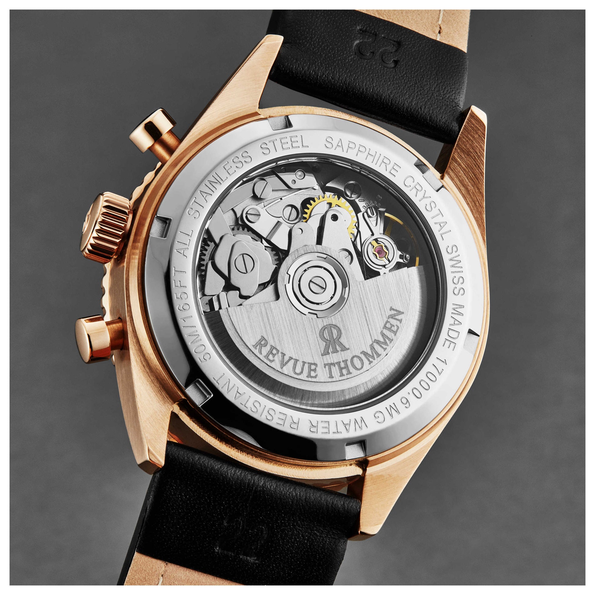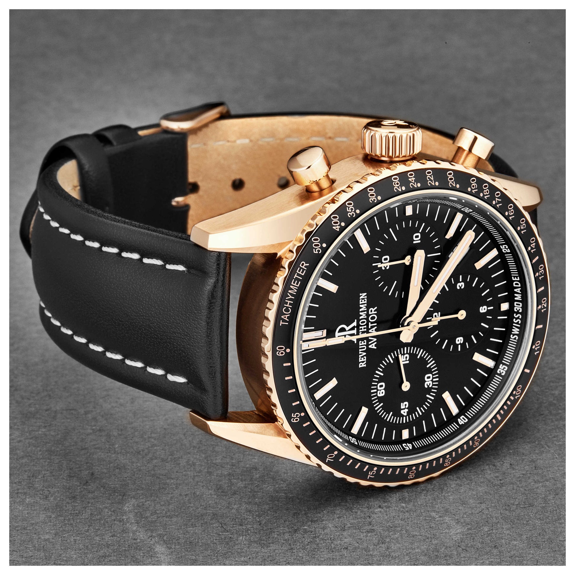 Elevate your style with the Revue Thommen Aviator watch, a men's accessory crafted in Switzerland for precision and durability. This automatic watch features a SW510A Swiss-made movement encased in a 42mm rose gold IP stainless steel case. It comes with a black unidirectional bezel, black dial, and is protected by scratch-resistant sapphire crystal. The watch offers a water resistance of up to 50m. Its features include a chronograph and date, adding utility to elegance. The black leather strap perfectly complements the watch case and secures with a pin buckle for a snug fit. 17000.6567