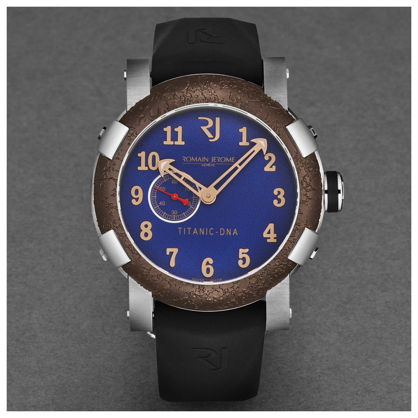 Discover the exceptional craftsmanship of the Romain Jerome Titanic watch, a masterpiece created for the discerning gentleman. Swiss-made with an automatic movement, this men's timepiece showcases a 46mm stainless steel case with a striking blue dial, protected by scratch-resistant sapphire crystal. The robust case, coupled with a pull and push crown, ensures water resistance up to 30m. A black rubber strap adds a sporty touch, fastening securely with a deployment clasp. Hailing from the esteemed Titanic collection, this watch effortlessly melds style and durability. RJTIAU.503.10