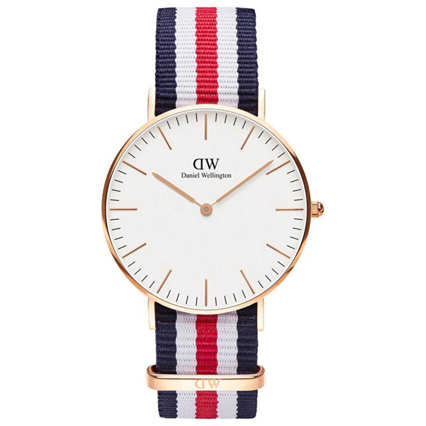 Crafted with precision, the Daniel Wellington Canterbury watch features a quartz movement made in Japan, encapsulated in a durable stainless steel round case with a mineral crystal. This unisex timepiece boasts a striking white dial, complemented by a red and blue fabric strap secured with a pin buckle. At 36mm in diameter and water-resistant up to 30m, it merges functionality with style in every detail. DW00600030