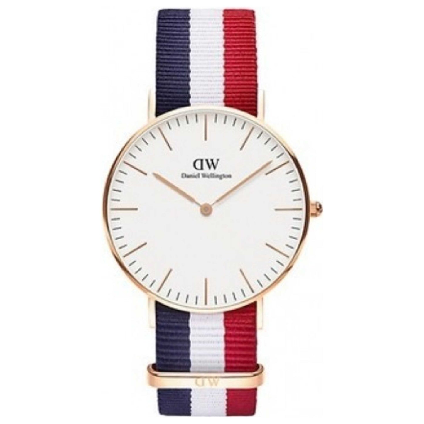 Featuring the Daniel Wellington Cambridge collection, this unisex watch showcases a pristine white dial and a red and blue fabric strap with a pin buckle clasp. Crafted with a 36mm stainless steel round case, mineral crystal, and powered by a made-in-Japan quartz movement, this timepiece combines functionality with timeless design. Water-resistant up to 30 m (100 feet), it's perfect for daily wear while reflecting a classic yet versatile style. DW00600032