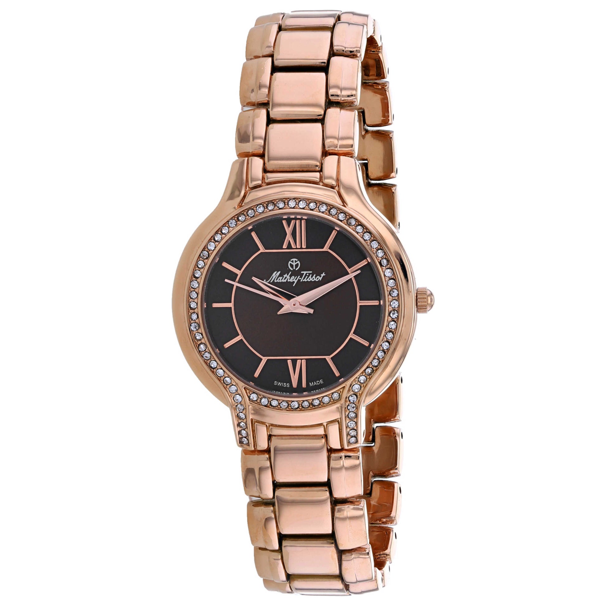 Elevate your look with the Mathey Tissot Classic collection watch, crafted with the sophisticated woman in mind. This Swiss-made quartz movement timepiece features a round 28mm stainless steel case showcasing a stylish brown dial, protected by a scratch-resistant sapphire crystal. The pull and push crown allows easy time setting, and with its 50m water resistance, this watch offers impressive durability. The rose gold stainless steel bracelet adds a touch of elegance and securely fastens with a jewelry clasp, enhancing the overall appeal of the watch. D2781PM