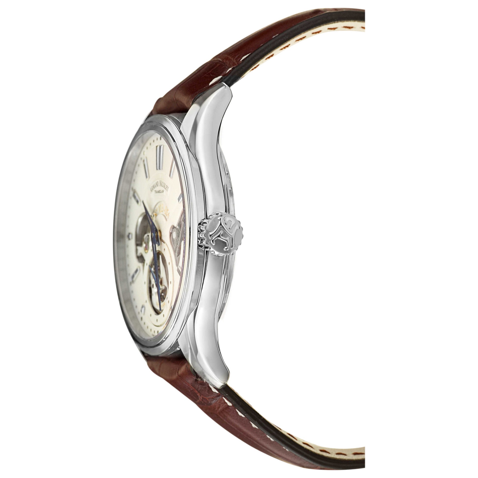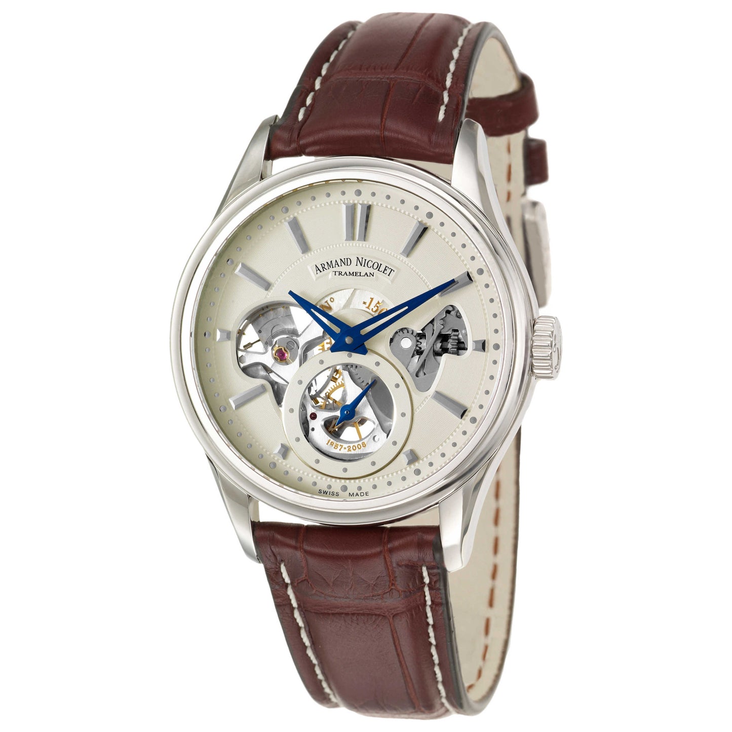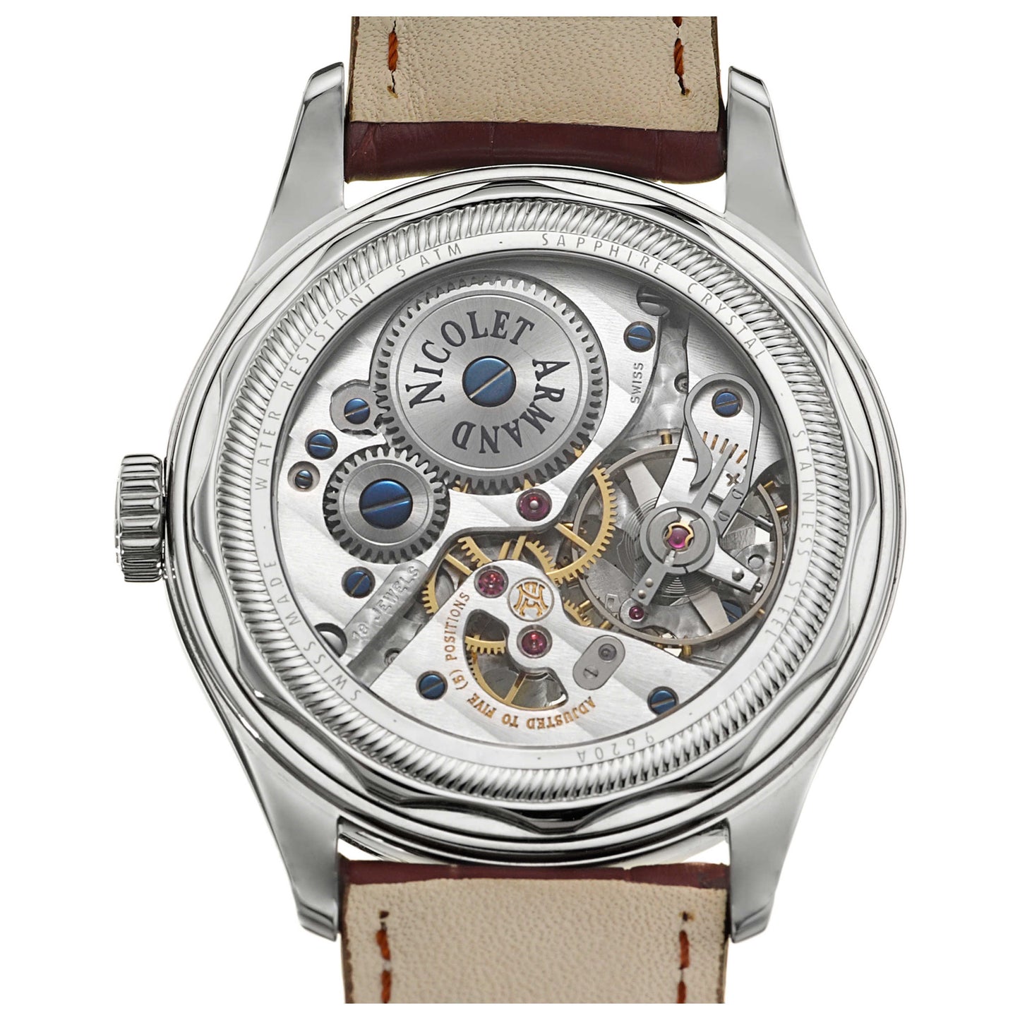 Armand Nicolet has done something spectacular with the L08 collection- they have turned back the hands of time and recreated an amazing manual wind mechanical movement called AN0711A. AN0711A is a movement with a lot of history; its integral parts were first produced for the UT 600 in 1957. It has since been modernized and endowed with 21st Century technology. The movement has been enhanced with a shock absorbing system and the in-house developed Swan Neck mechanism of adjustment. The heart of this historic mechanical movement beats with 18,000 vibrations per hour- it can be seen through the sapphire glass protecting it on both sides. The 18 jewel calibre which has been finely decorated with "Cote de Genve" finishing and embellished by "Perlage" is exquisitely finished with rhodium plating on the plate and bridges. At the center of it all is the delicate engraving reminding you that your timepiece is one of a kind- a beautiful masterpiece- only one of one hundred and fifty in the world. Armand Nicolet, L08, Men's Watch, Stainless Steel Case, Leather Alligator Strap, Swiss Mechanical Manual (Hand-Winding), 9620A-AG-P713MR2