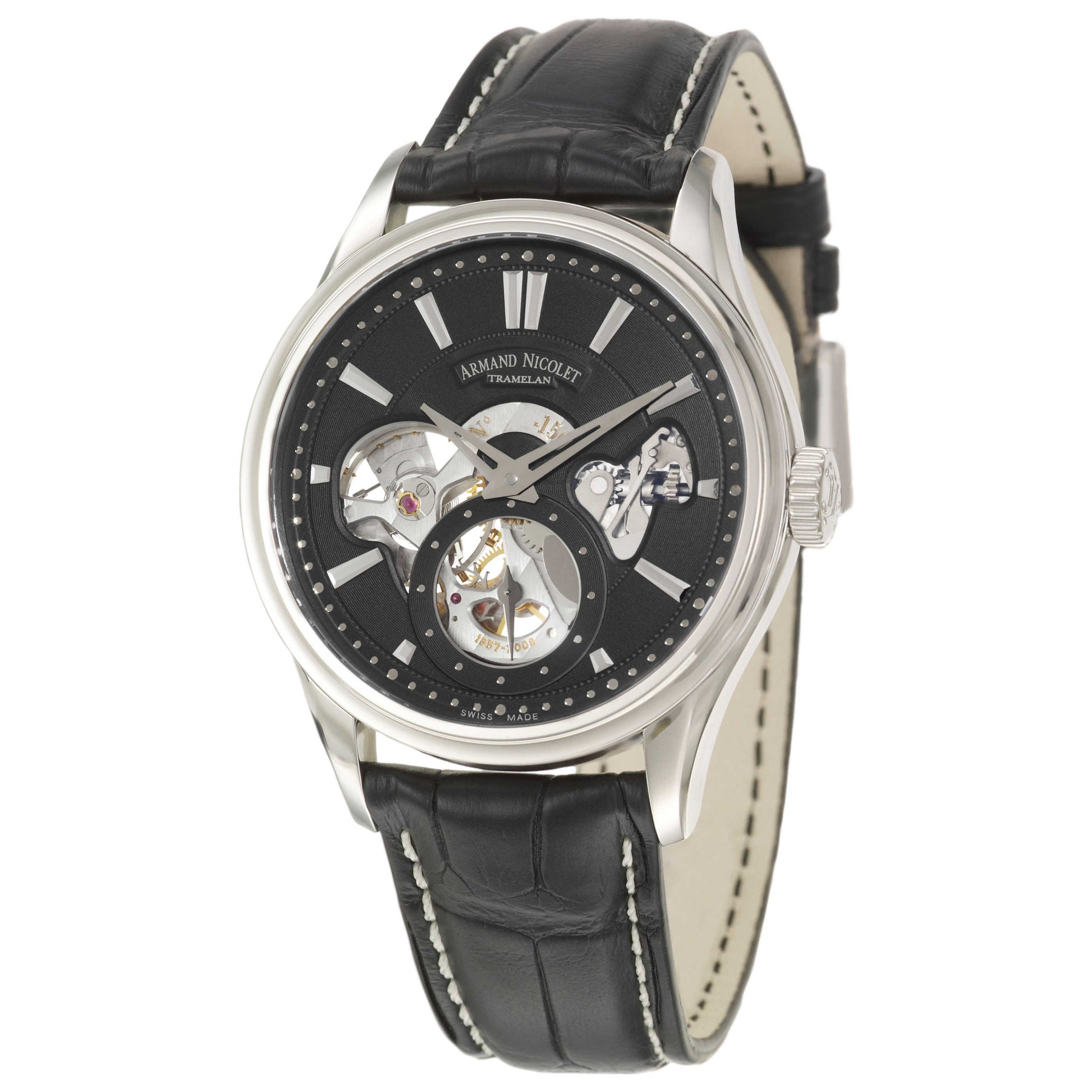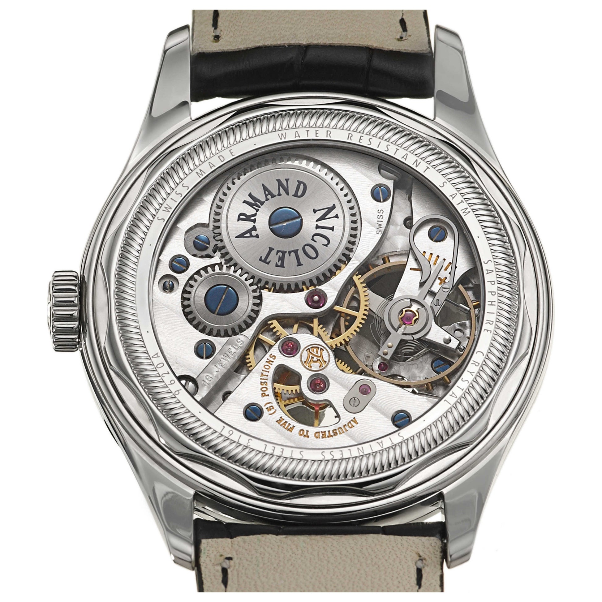 Armand Nicolet has done something spectacular with the L08 collection- they have turned back the hands of time and recreated an amazing manual wind mechanical movement called AN0711A. AN0711A is a movement with a lot of history; its integral parts were first produced for the UT 600 in 1957. It has since been modernized and endowed with 21st Century technology. The movement has been enhanced with a shock absorbing system and the in-house developed Swan Neck mechanism of adjustment. The heart of this historic mechanical movement beats with 18,000 vibrations per hour- it can be seen through the sapphire glass protecting it on both sides. The 18 jewel calibre which has been finely decorated with "Cote de Genve" finishing and embellished by "Perlage" is exquisitely finished with rhodium plating on the plate and bridges. At the center of it all is the delicate engraving reminding you that your timepiece is one of a kind- a beautiful masterpiece- only one of one hundred and fifty in the world. Armand Nicolet, L08, Men's Watch, Stainless Steel Case, Leather Alligator Strap, Swiss Mechanical Manual (Hand-Winding), 9620A-NR-P713NR2