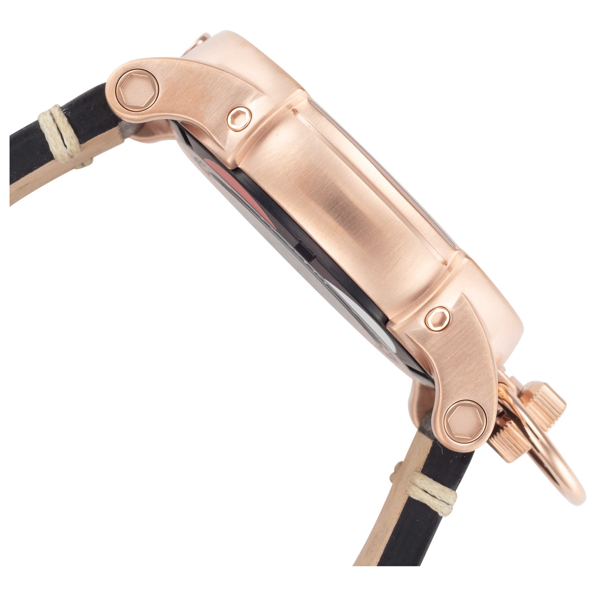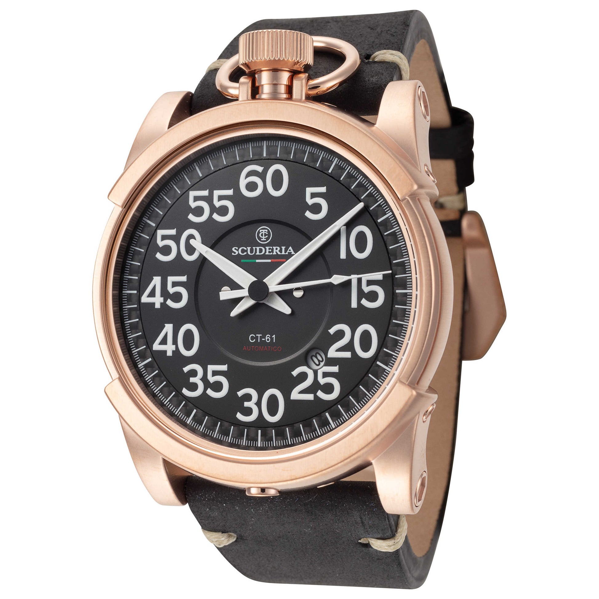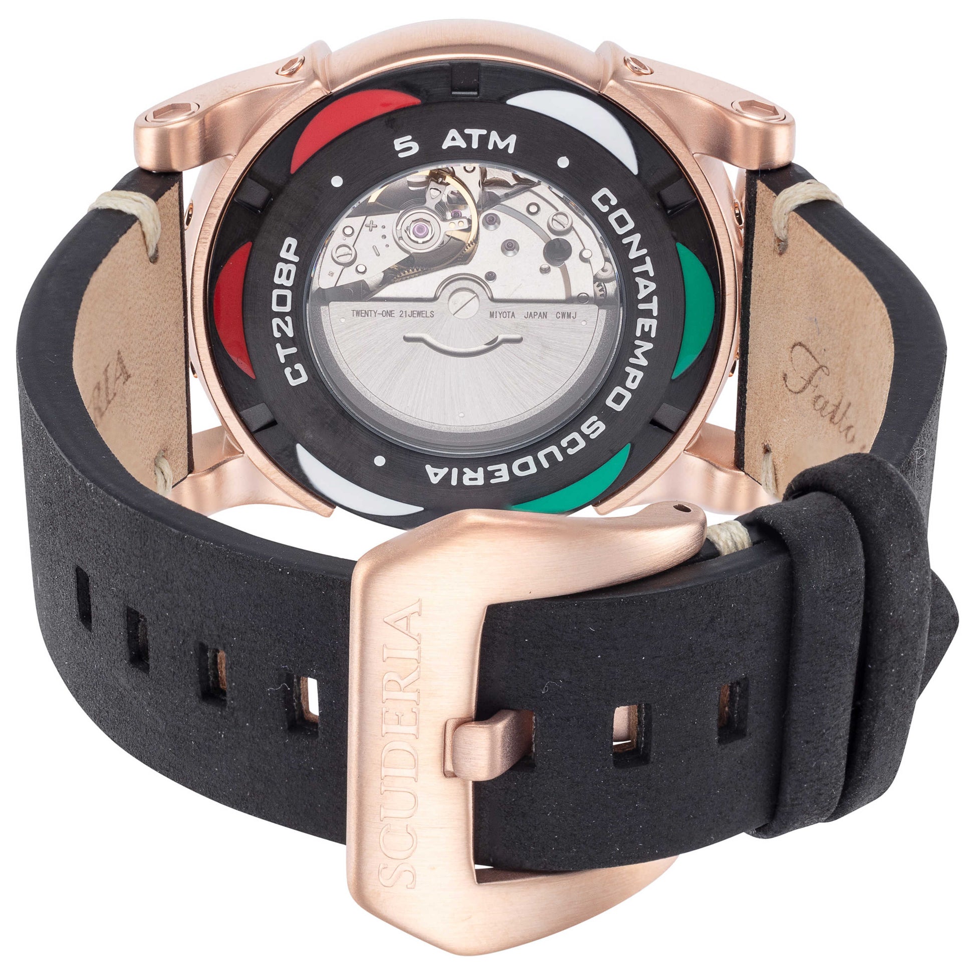 Introducing the CT Scuderia Corsa Automatico, a men's watch that combines functionality with an undeniable style. Crafted with a round rose gold PVD stainless steel case and a sleek black dial, this automatic Miyota 9015 timepiece is a product of Japanese precision. It comes with an exhibition case back and a sturdy mineral crystal that secures its complex workings. The screw-down crown and impressive 42-hour power reserve stand as testaments to its high performance. Housed within a 44mm case, this watch has a 50m water resistance, ensuring resilience against everyday challenges. The black leather strap and pin buckle closure lend a refined touch, solidifying its position as a must-have for every gentleman. CT-208-P