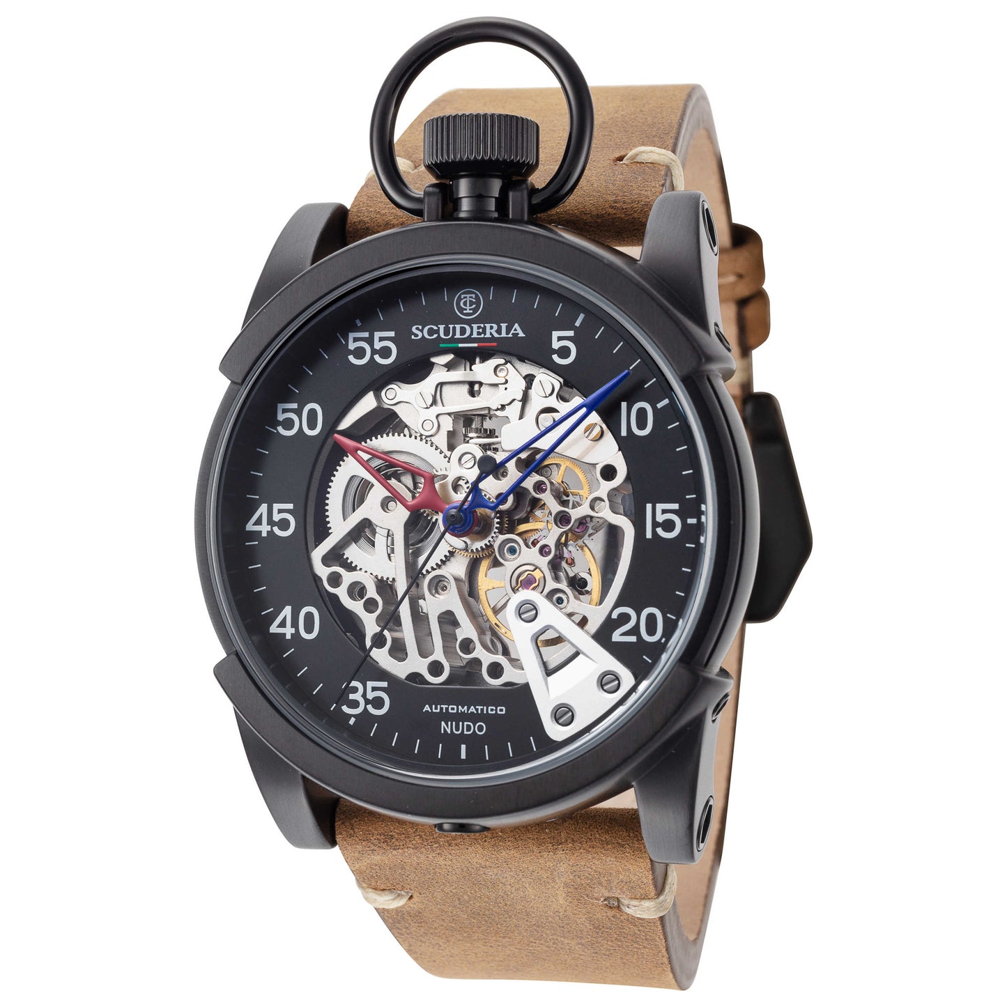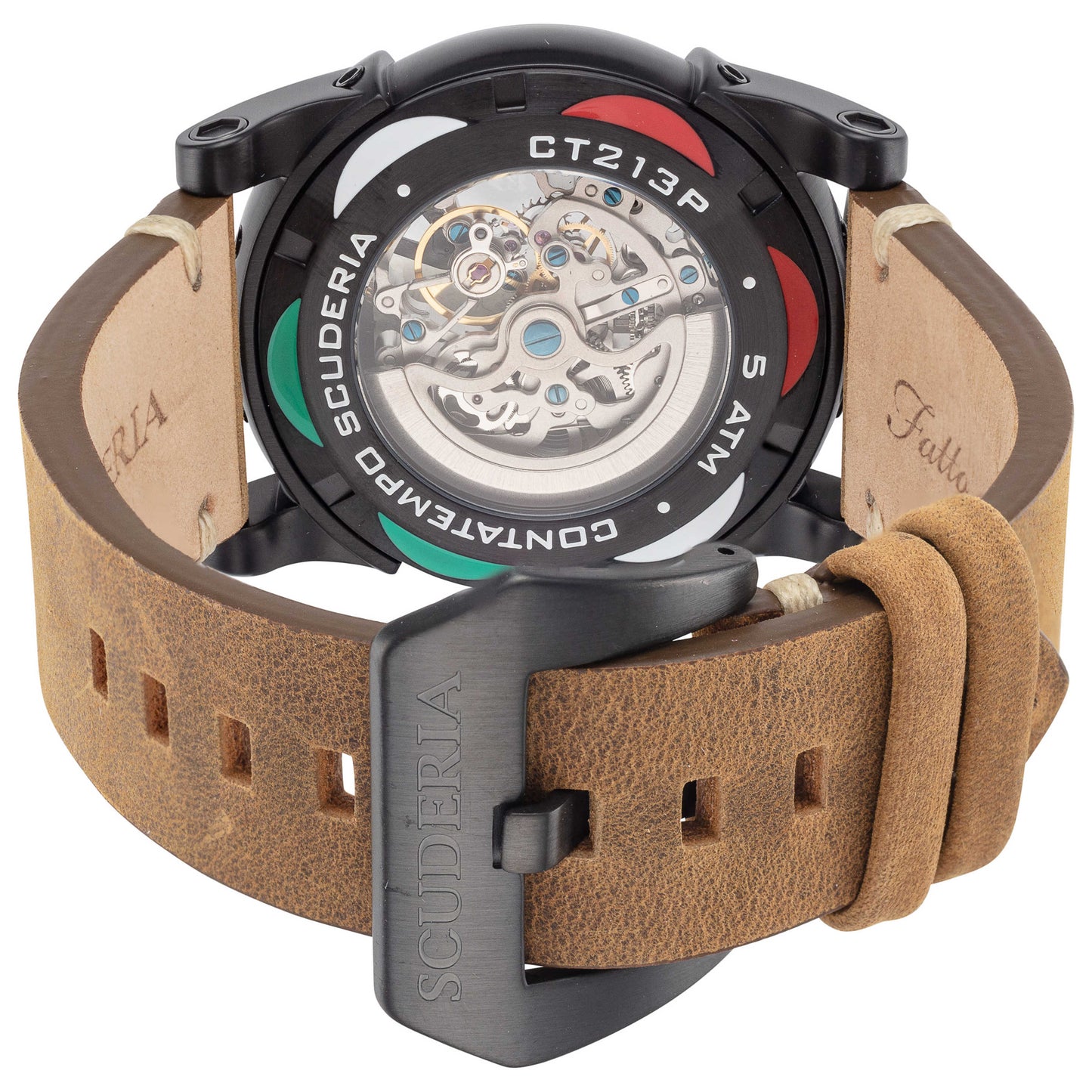 Showcase your sophisticated style with the CT Scuderia Corsa Automatico watch, the perfect companion for modern men. This round timepiece, complete with a 44mm stainless steel case, houses a captivating skeleton dial that unveils its intricate Miyota 8N40 automatic movement. Made in Japan, the movement is not just reliable but also has an impressive 42-hour power reserve. This watch is designed for longevity with a screw-down crown, 50m water resistance, and a mineral crystal protecting the dial. The brown leather strap, secured by a pin buckle, completes the overall stylish aesthetic of this men's watch. CT-213-P
