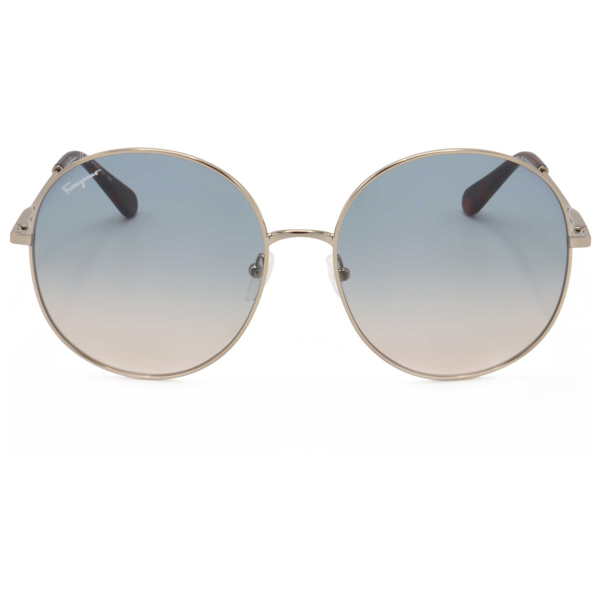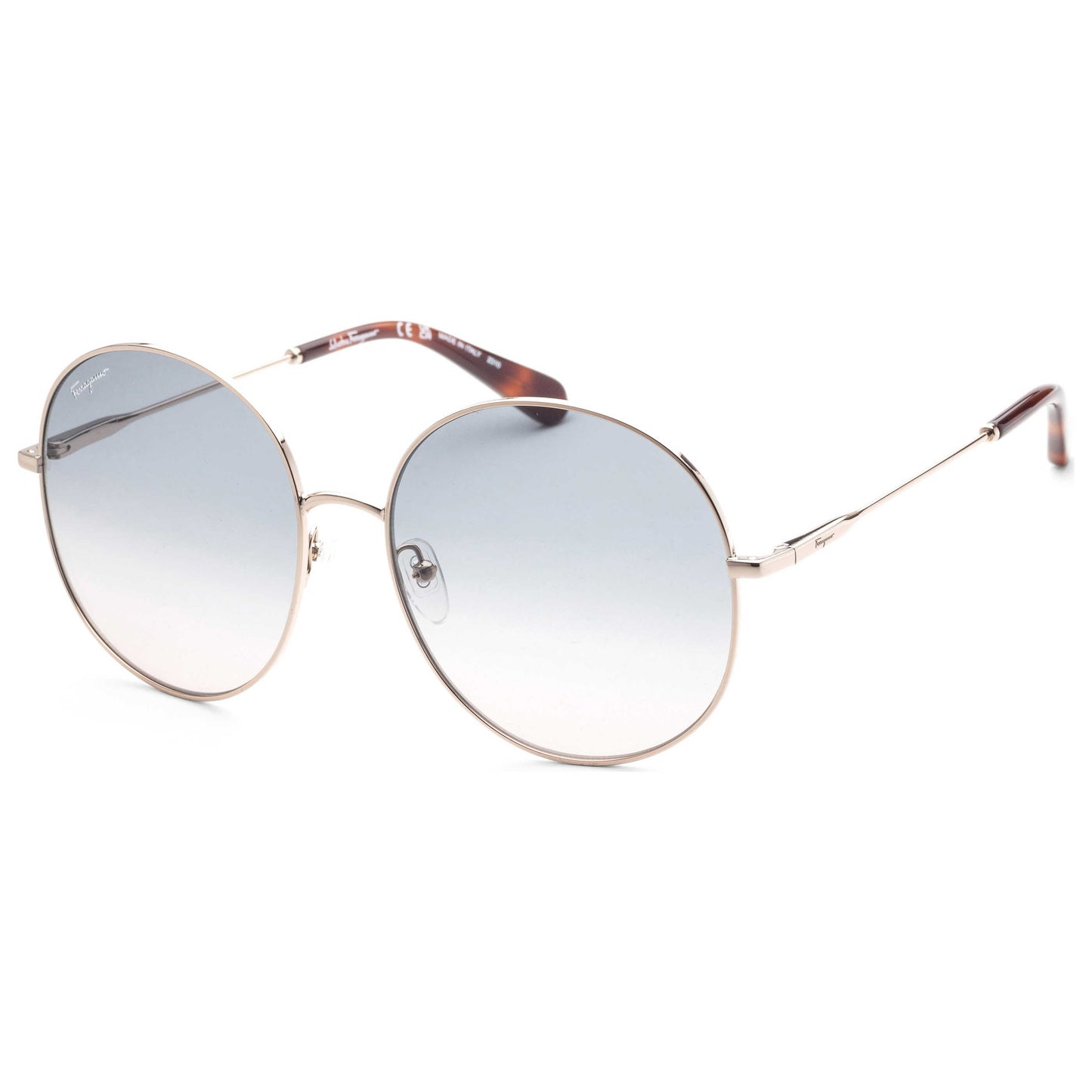 Indulge in the luxury of Ferragamo women's sunglasses. Showcasing rose gold metal frames with a stylish round shape, these glasses flaunt blue lenses of 60mm width, providing 100% UV protection. Crafted in Italy. SF299S-688-60