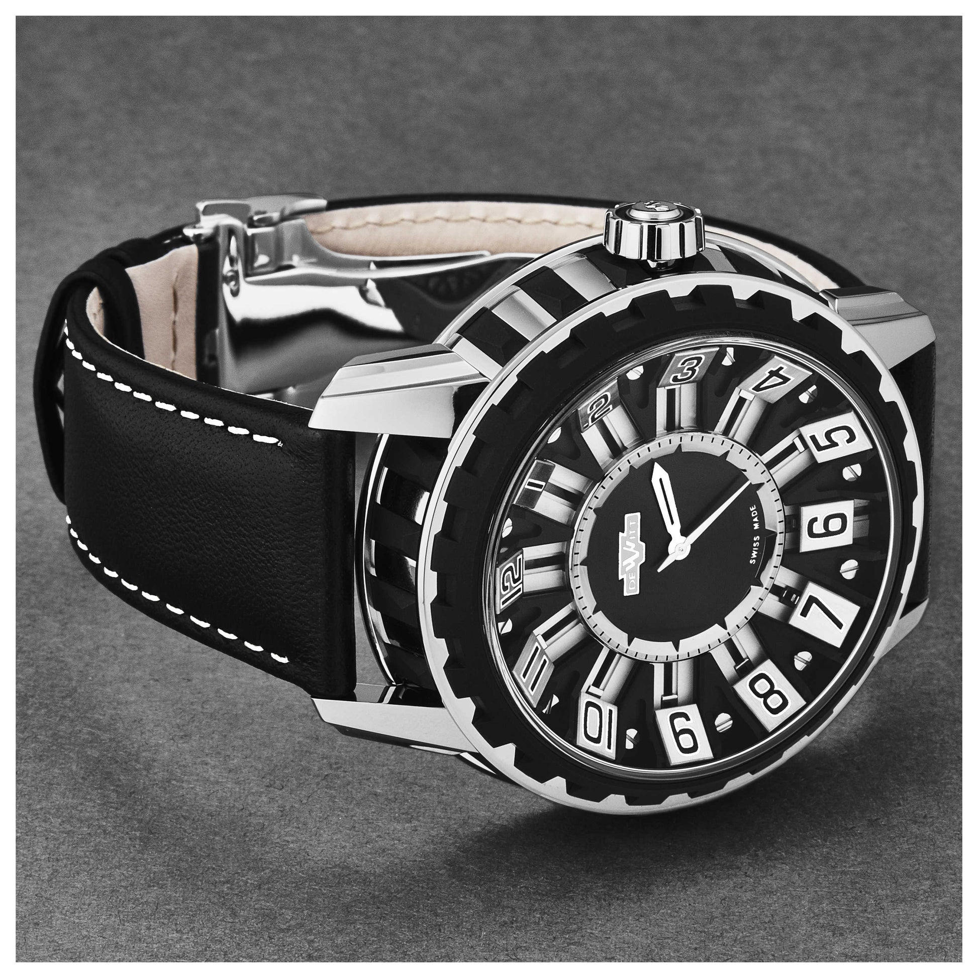 Elevate your style with the DeWitt Academia men's watch, a quintessential Swiss-made timepiece for the sophisticated gentleman. This automatic watch is equipped with a pull and push crown and boasts a remarkable 42-hour power reserve. Enclosed in a 49.2mm titanium case is a striking black dial, protected by scratch-resistant sapphire crystal and enhanced by an exhibition case back. It offers 30m water resistance for durability. The watch's chic aesthetic is completed with a black leather strap that fastens securely with a deployment clasp. AC.SLD.004 RPB