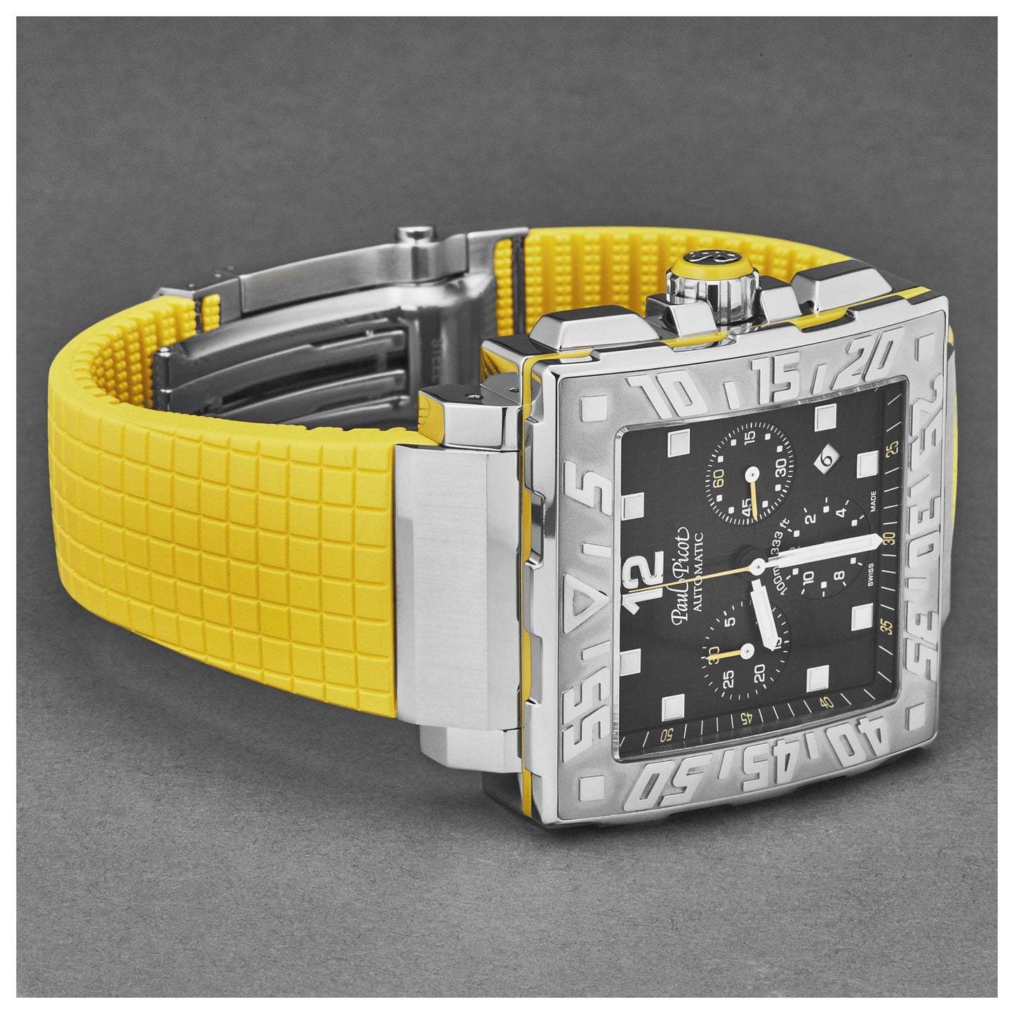 Elevate your look with the Paul Picot C-Type watch, a striking accessory engineered for the discerning gentleman. This Swiss-made timepiece showcases an automatic movement encased in a 42mm stainless steel square case, complete with a screw-down crown for effortless time adjustments. Protected by a scratch-resistant sapphire crystal and featuring a closed back, it delivers remarkable durability and an impressive water resistance of up to 100m. Its bold black dial, coupled with chronograph and date features, adds a layer of functionality. A vibrant yellow rubber strap with a deployment clasp adds a pop of color, ensuring a secure and comfortable fit. P0830SG56013301