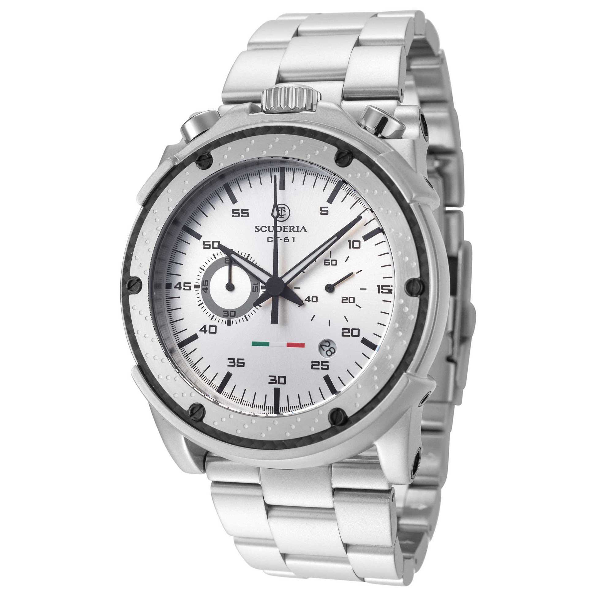 Accelerate your style with the CT Scuderia Racer watch, an ideal timepiece for men who appreciate high-speed elegance. This round quartz chronograph is powered by a Made in Japan Miyota 0S11 caliber, nestled within a 44mm stainless steel case. It features a screw-down crown and a closed case back for enhanced durability. The silver dial is protected under a mineral crystal and offers a brilliant contrast to the stainless steel bracelet, colored in matching silver. With 50m water resistance and a secure deployment clasp, this watch ensures both practicality and sophistication in abundance. CT-243-P