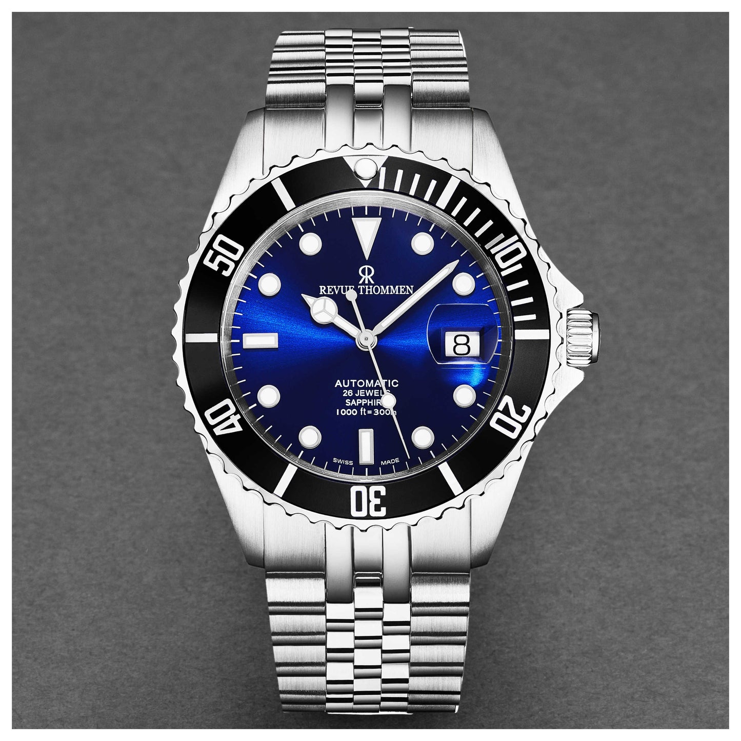 Discover the masculine elegance of the Revue Thommen Diver watch, a Swiss-made piece meticulously crafted for the modern man. This automatic movement watch features a sturdy round 42mm stainless steel case that showcases a striking blue dial protected by a scratch-resistant sapphire crystal. A screw-down crown ensures 300m water resistance, making it a perfect companion for underwater adventures. The date feature adds functionality, while the silver stainless steel bracelet, secured by a deployment clasp, exudes class and durability. Experience a new level of sophistication with this robust timepiece. 17571.2223