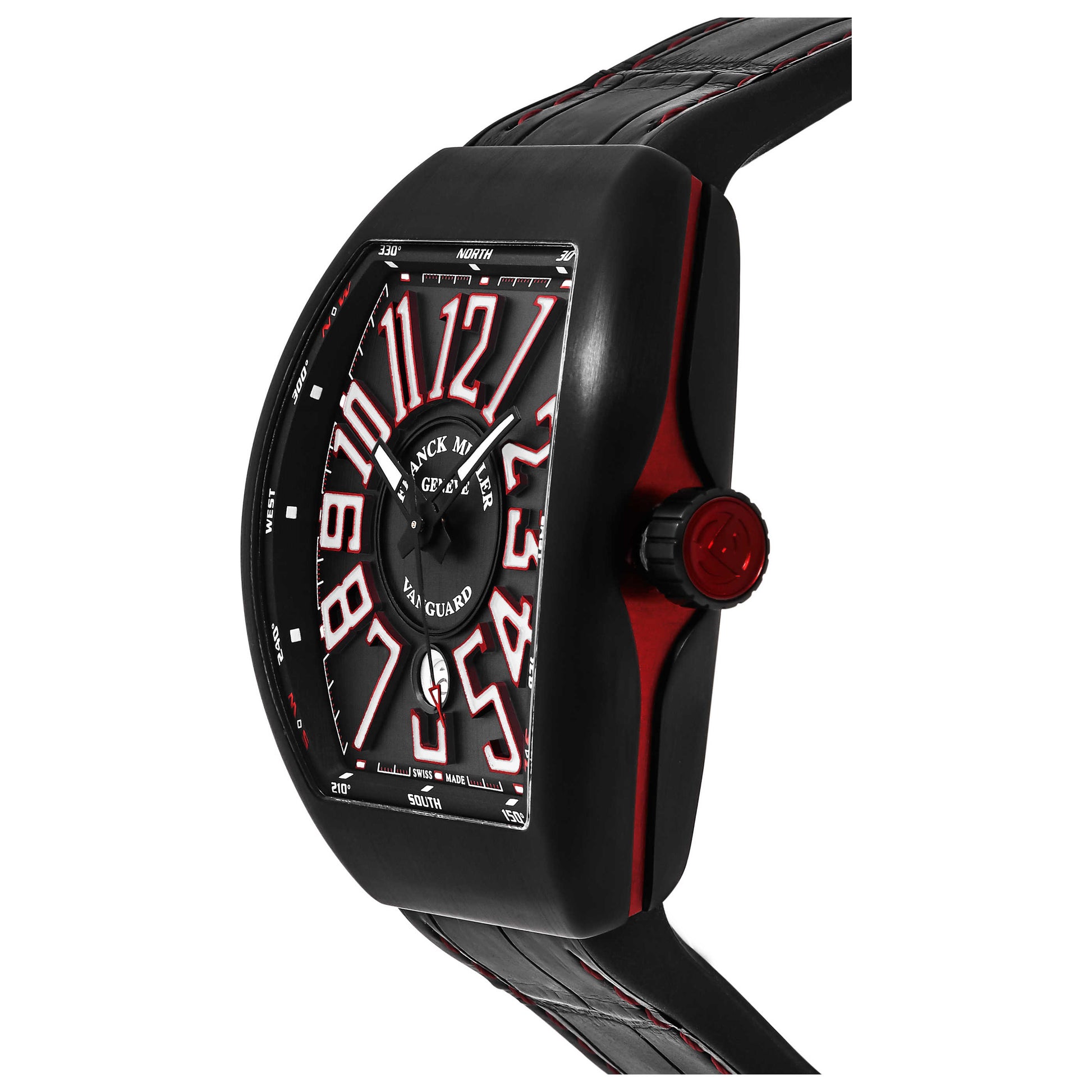 Experience the craftsmanship of Swiss horology with the Franck Muller Vanguard men's watch. Fashioned from durable titanium, this automatic movement timepiece exhibits a robust rectangular 45mm case with a screw-down crown and 30m water resistance. Its stunning black dial, complemented by a date feature, contrasts beautifully with the rugged black rubber strap that secures effortlessly with a deployment clasp. Made in Switzerland, this Swiss-made movement watch promises precision and style. 45SCBLKBLKWHT